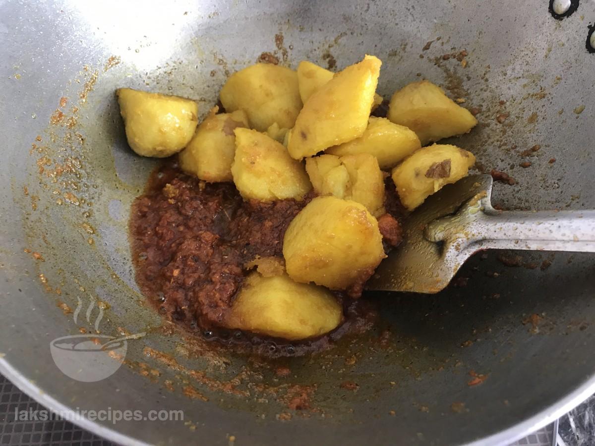 - Now add the cooked pieces of boiled potato to the kadhai. Stir to mix and cook the ingredients together for 1 minute.