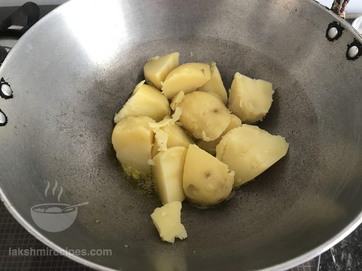 - Now heat some oil in a kadhai and when the oil is completely heated then add the chopped pieces of boiled potato to it.
