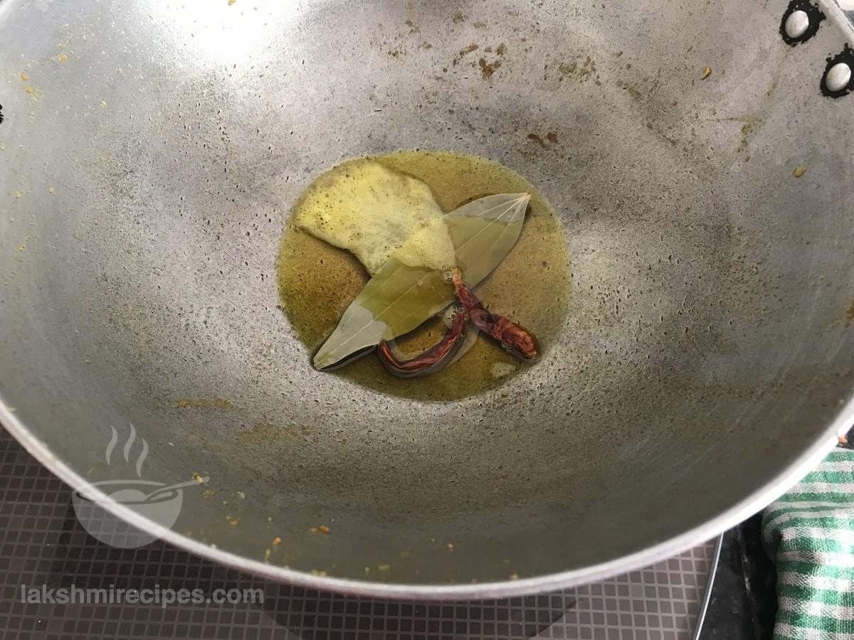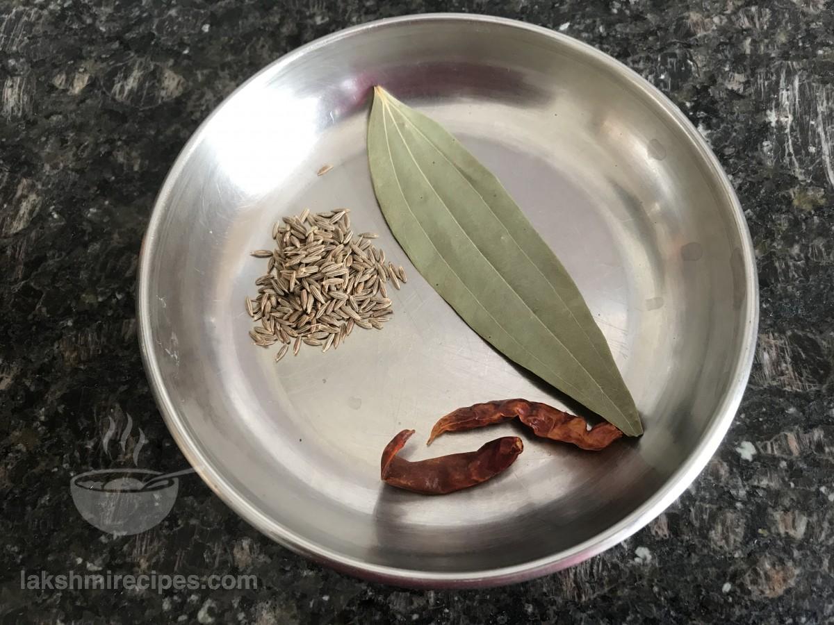 - जब तेल को अच्छी तरह गरम होजाए तो उसमें हींग, जीरा और तेज पत्ता डालें। आँच को मध्यम स्तर तक कम करें और जीरा को चटकने दें।