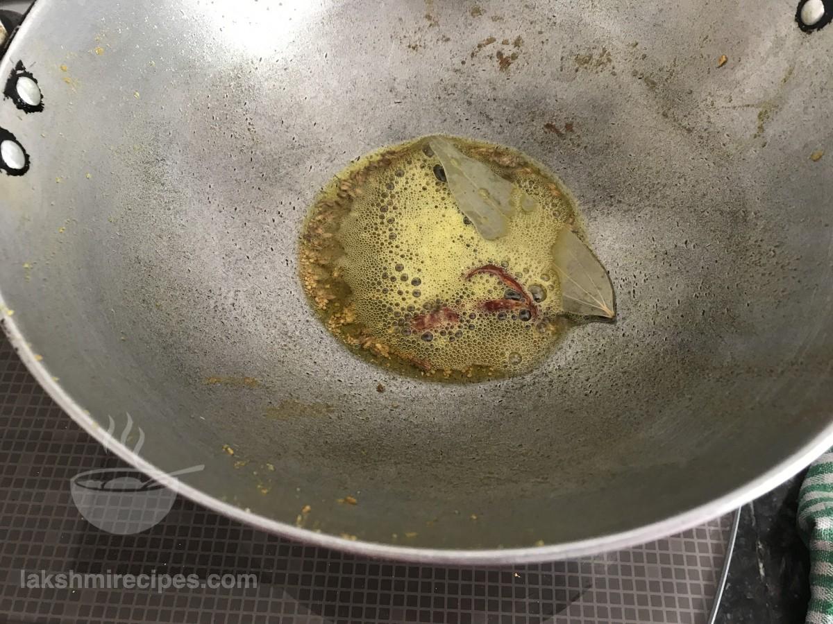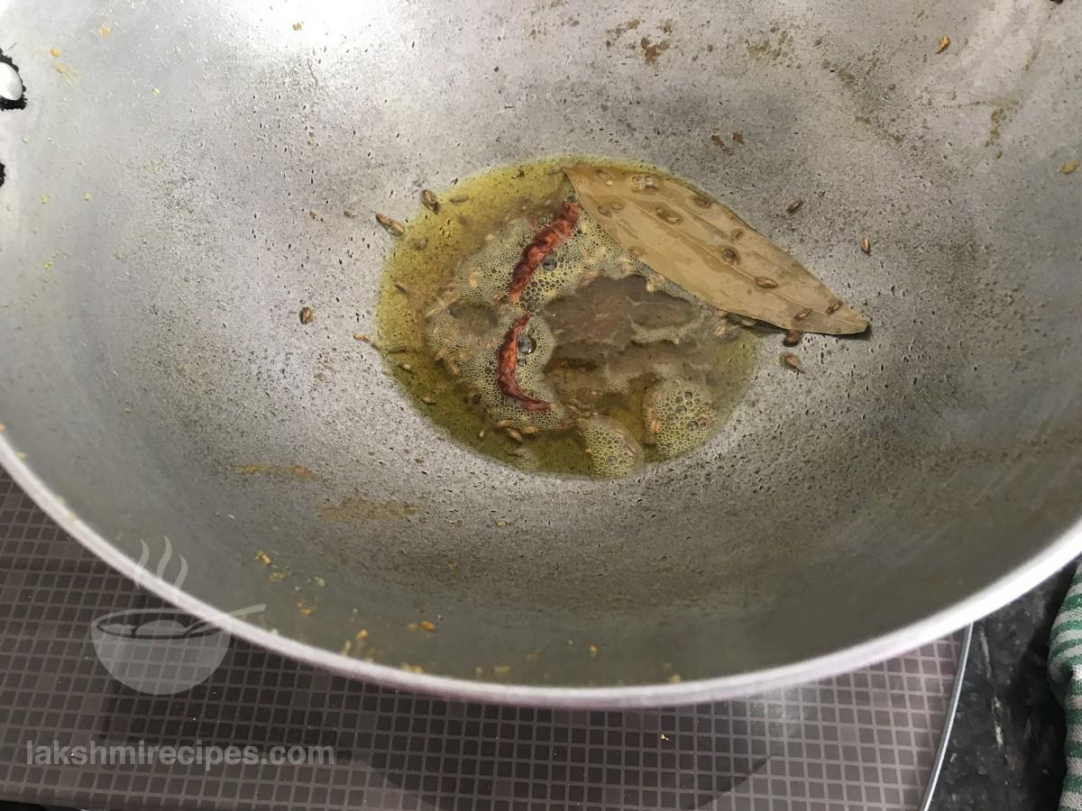 - When the oil is heated nicely then add asafoetida, cumin seeds and bay leaf to it. Lower the flame to medium level and allow the cumin seeds to crackle.