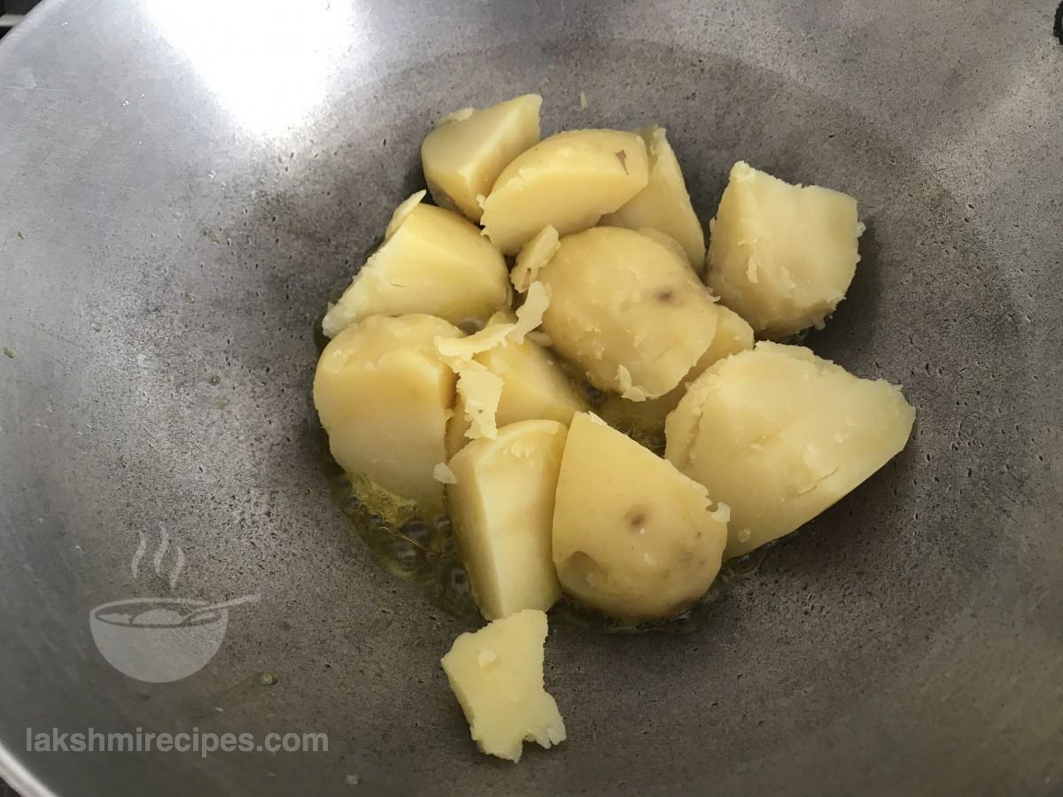 - अब कढ़ाई में उबले हुए आलू के टुकड़े डालें। 1 मिनट के लिए सामग्री अच्छे से चलते हुए एक साथ भूनें।