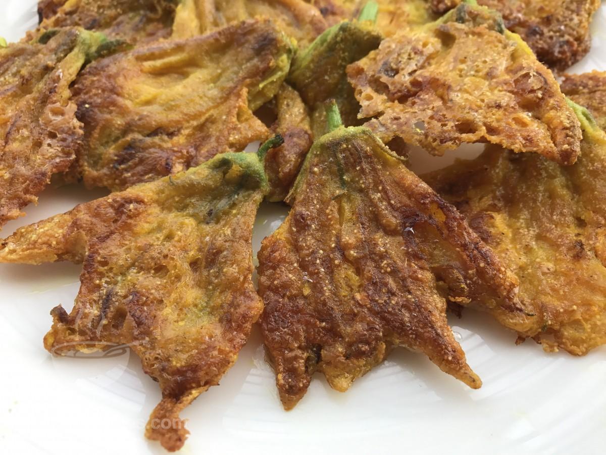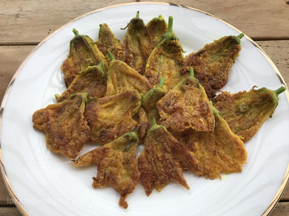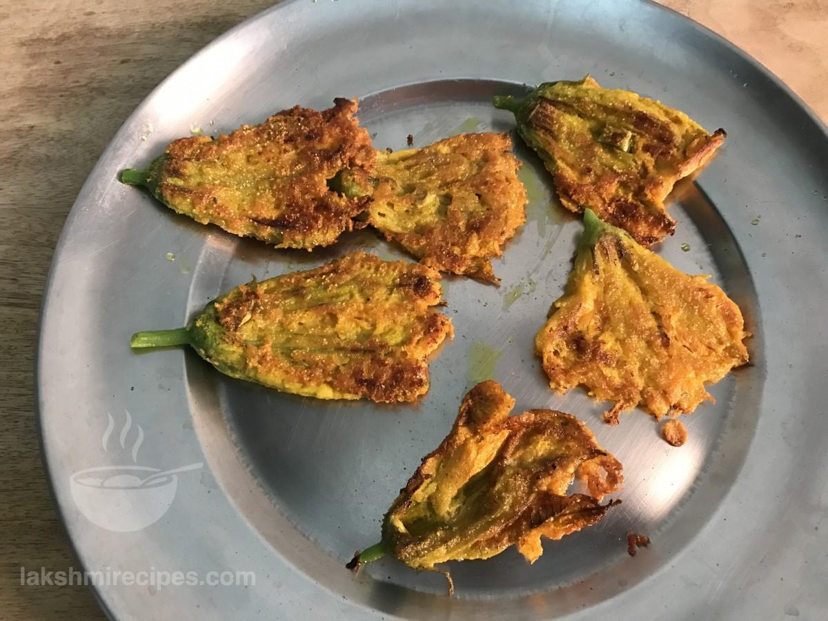 - Transfer the kaddu ke phool ke pakore (or Kumro Phooler Bhaja or Pumpkin flower fritters) prepard to a plate and prepare pakoras of the remaining pumpkin flowers in the same way. The kaddu ke phool ke pakore (or Kumro Phooler Bhaja or Pumpkin flower fritters) are ready to be served hot.
