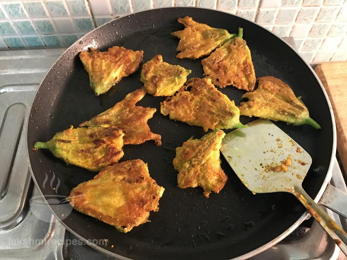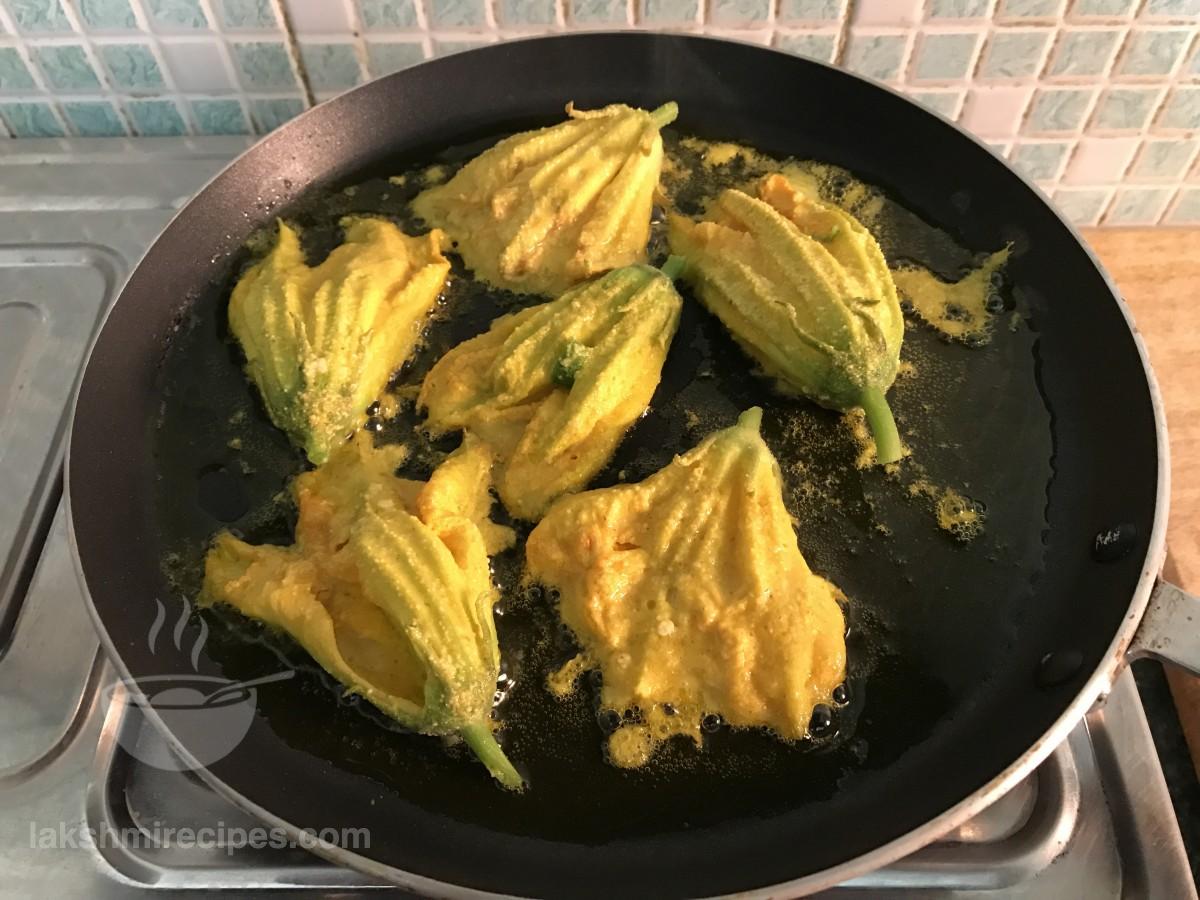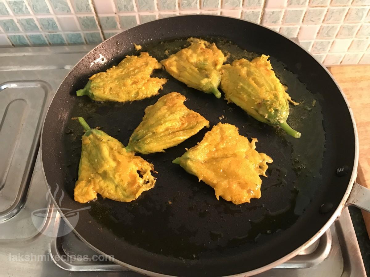 - जब एक ओर पक कर सुनहरा लाल हो जाए तो दूसरी तरफ़ उसी तरह पकाने के लिए फूलों को पलट दें। यदि आवश्यकता हो तो और तेल डालें।