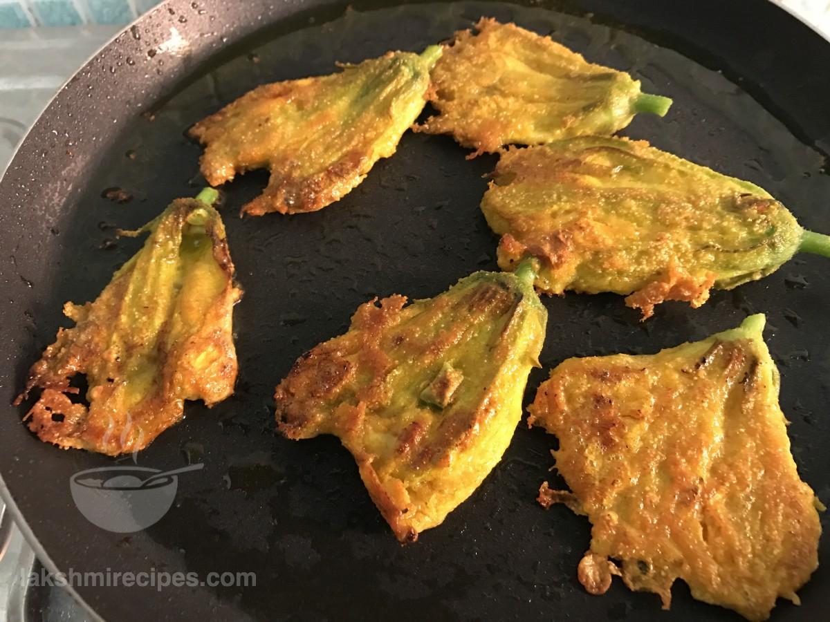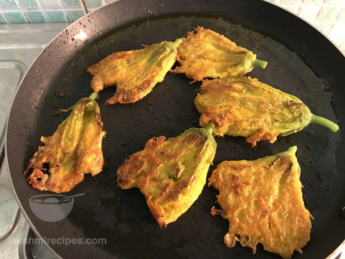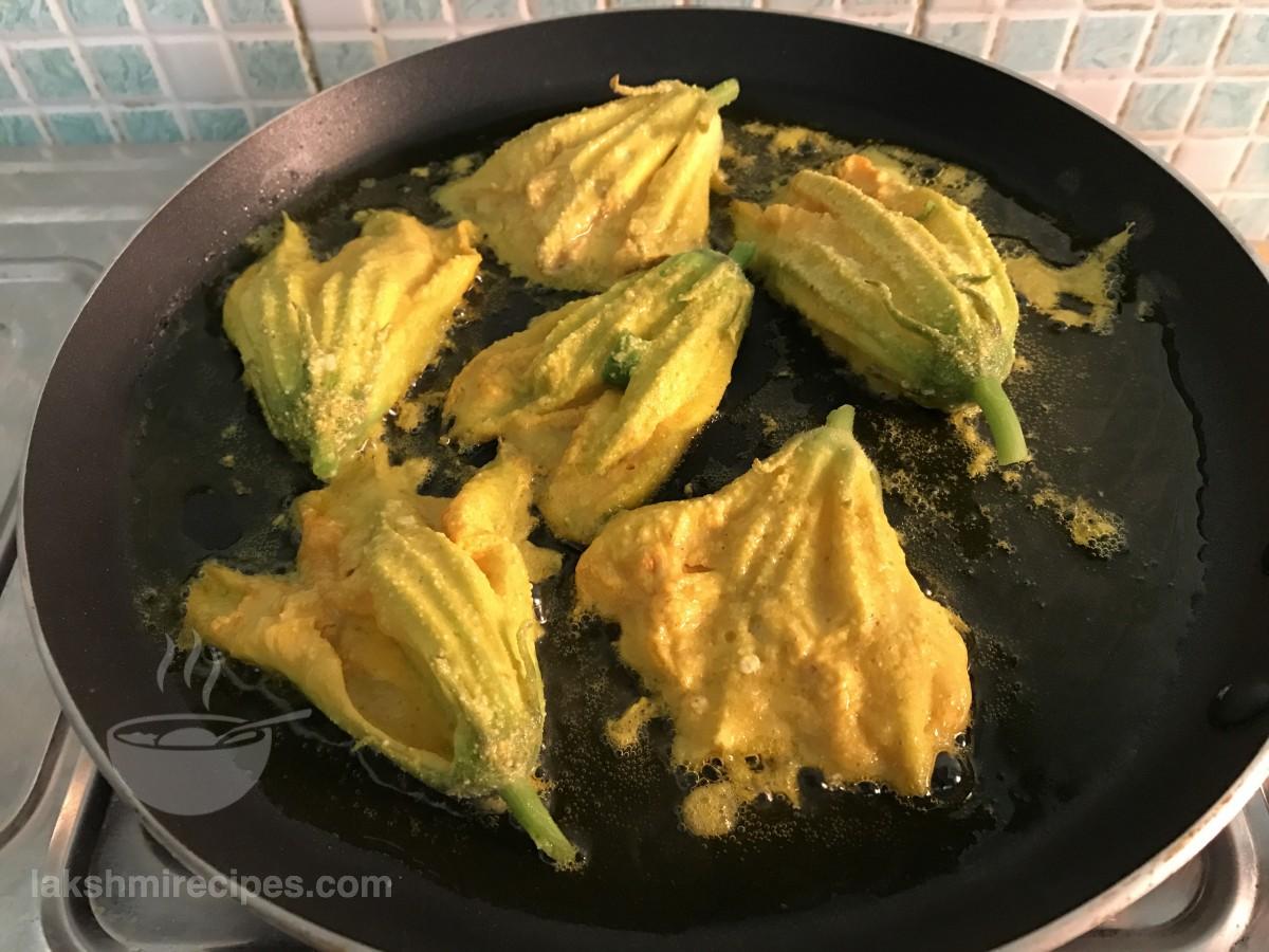 - जब एक ओर पक कर सुनहरा लाल हो जाए तो दूसरी तरफ़ उसी तरह पकाने के लिए फूलों को पलट दें। यदि आवश्यकता हो तो और तेल डालें।