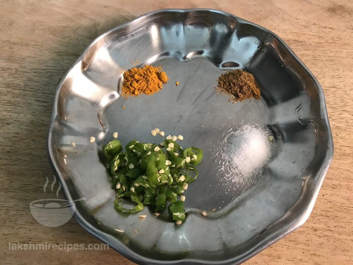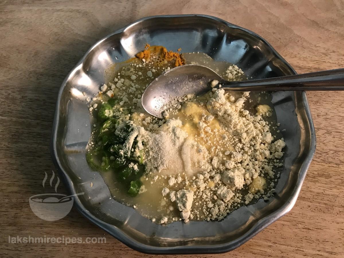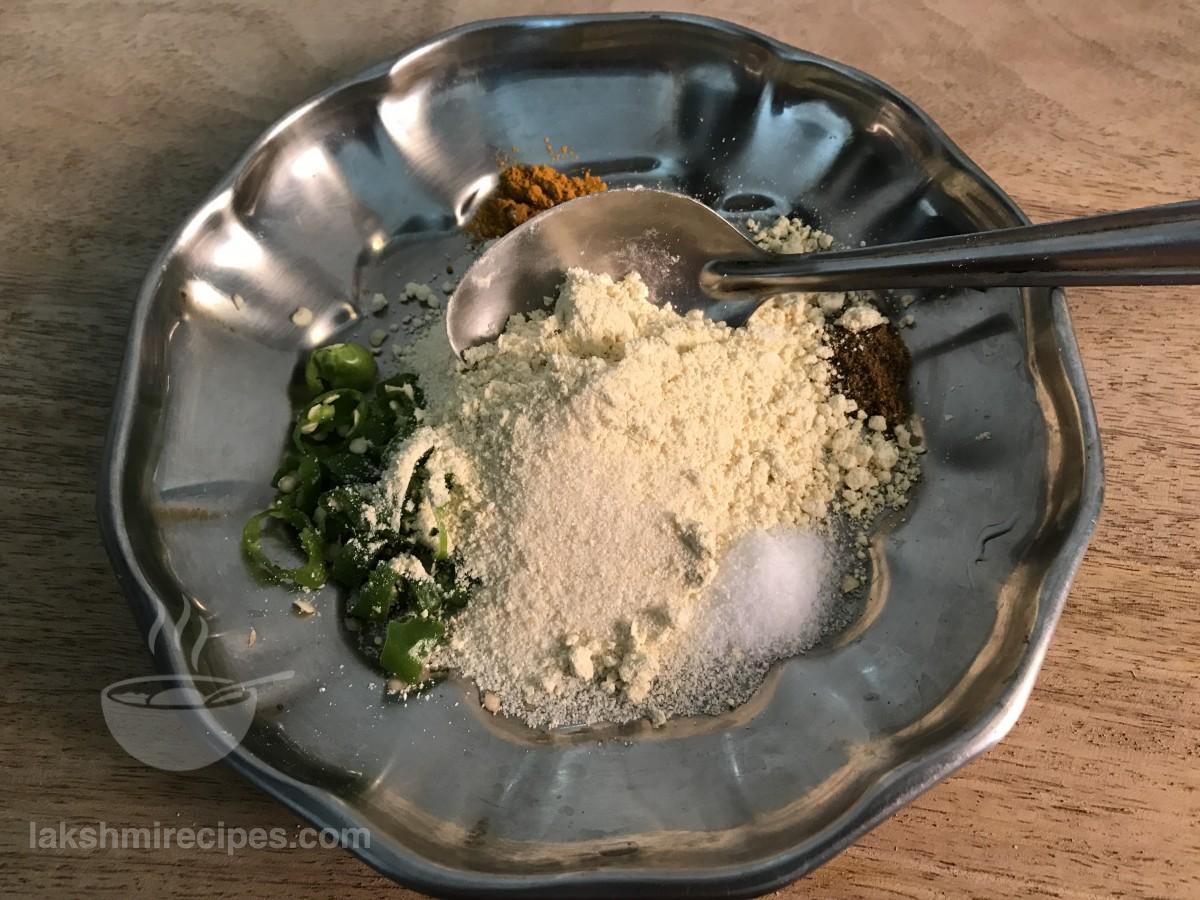 - Now add 1/2 tea spoon turmeric powder, salt as per taste, 1/2 tea spoon cumin seeds powder and finely chopped green chillis to it. Mix the dry ingredients together.