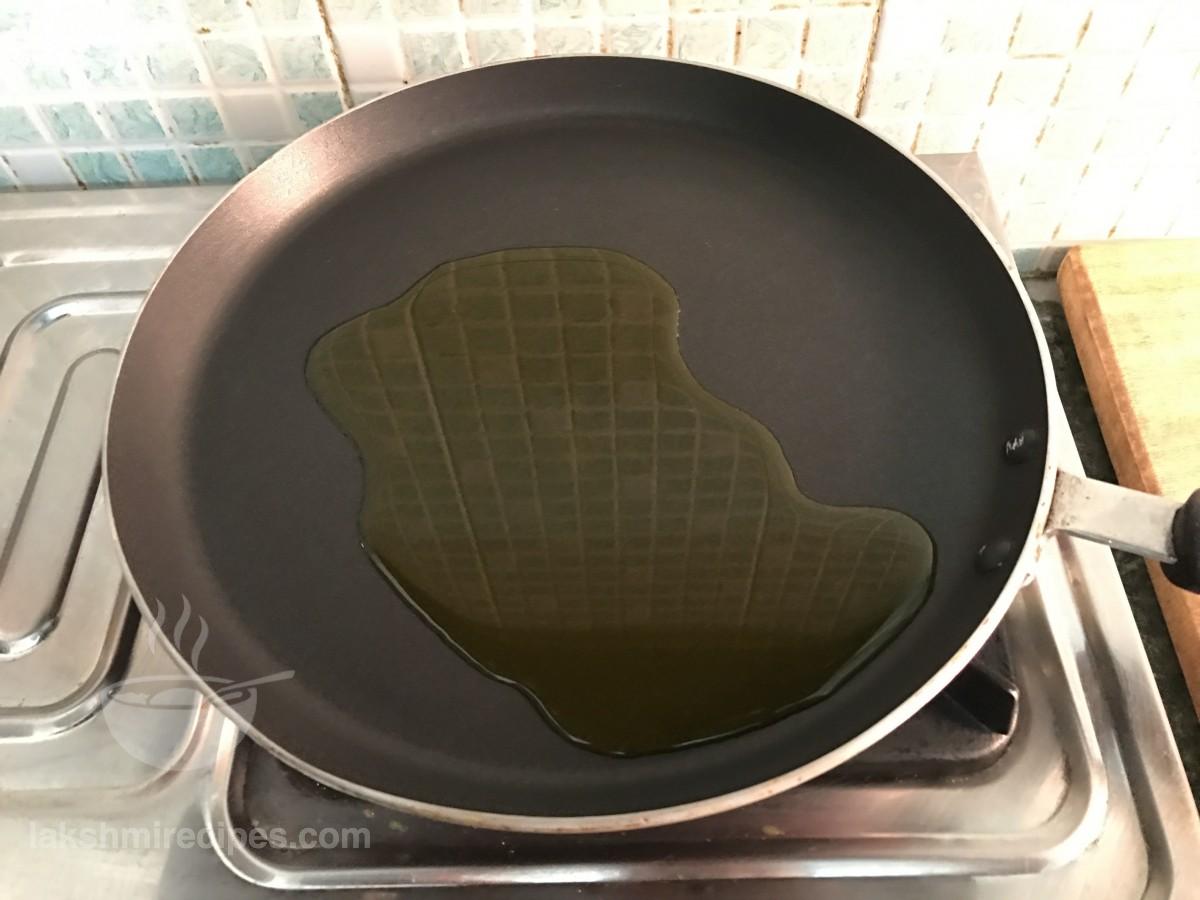 - Now heat a non-stick pan and then lower the flame. Pour 1 table spoon mustard oil on the pan and spread to grease the pan.