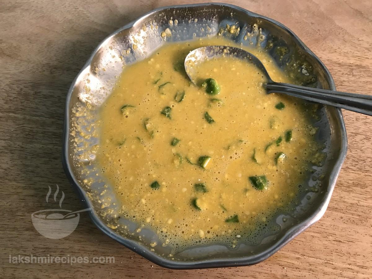 - Now add little water (approximately 1/2 cup) slowly to the dry mixture and prepare a batter of medium thin consistency.