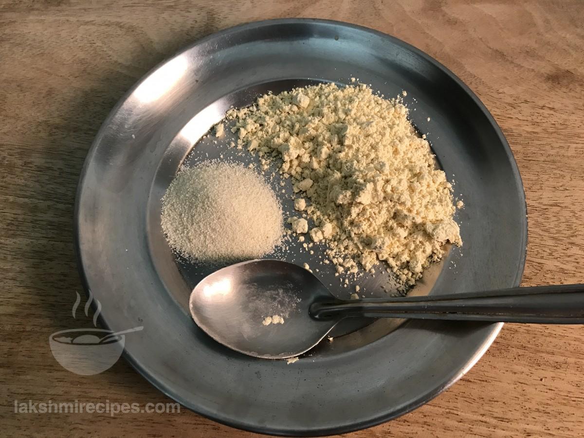 - एक और प्लेट में या मिक्सिंग कटोरे में बेसन और सूजी को डालें।