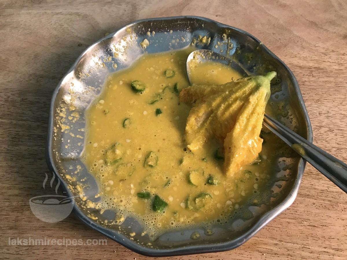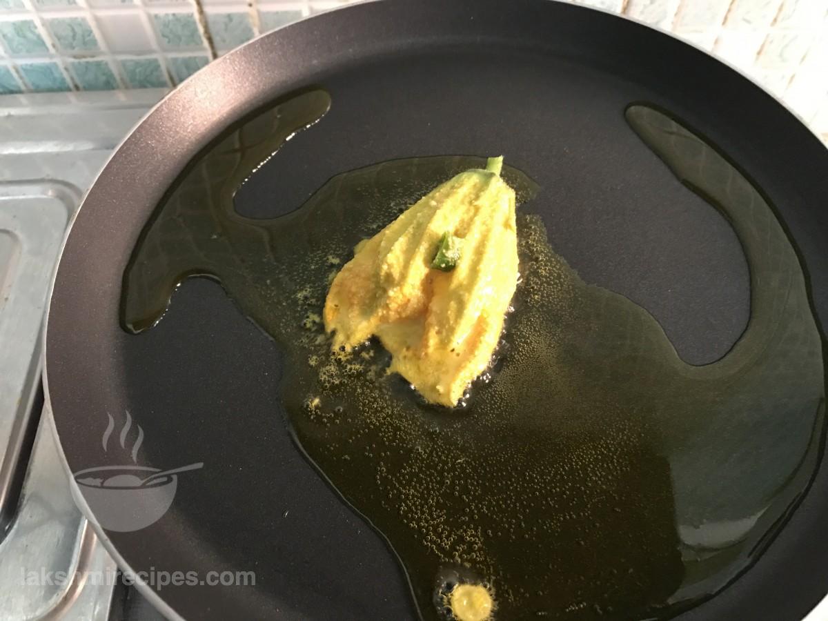 - एक कद्दू के फूल को लें और घोल में डुबाएं, ताकि घोल अच्छी तरह से फूल के हर तरफ लग जाए। फिर इस फूल को गर्म पैन पर रखें। इसी तरीके से 4-5 फूल तैयार करें और उन्हें भी पकने के लिए पैन पर रखें।