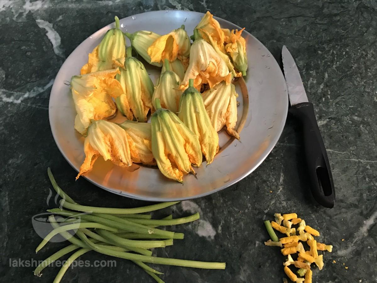 - कद्दू के फूलों के नीचे से काट कर उनकी स्टेम और अंदर के भाग को हटा दें। फिर शेष कद्दू के फूल को एक बड़े बर्तन में सादा पानी भरकर डाल दें। सादे पानी के साथ उन्हें अच्छी तरह से धोएं और फिर उन्हें एक साफ प्लेट में रखें।