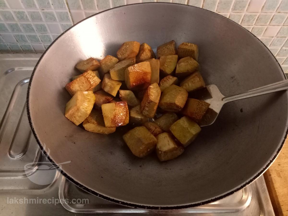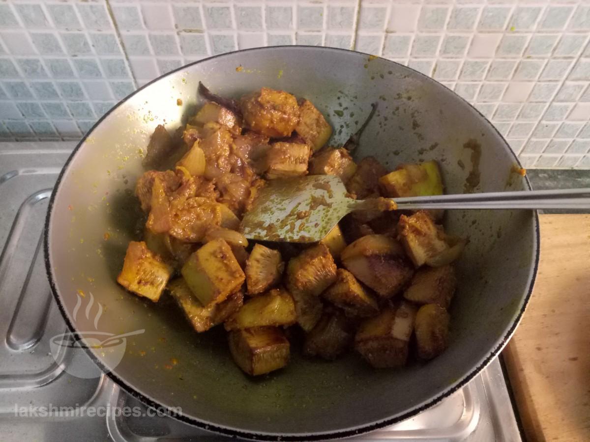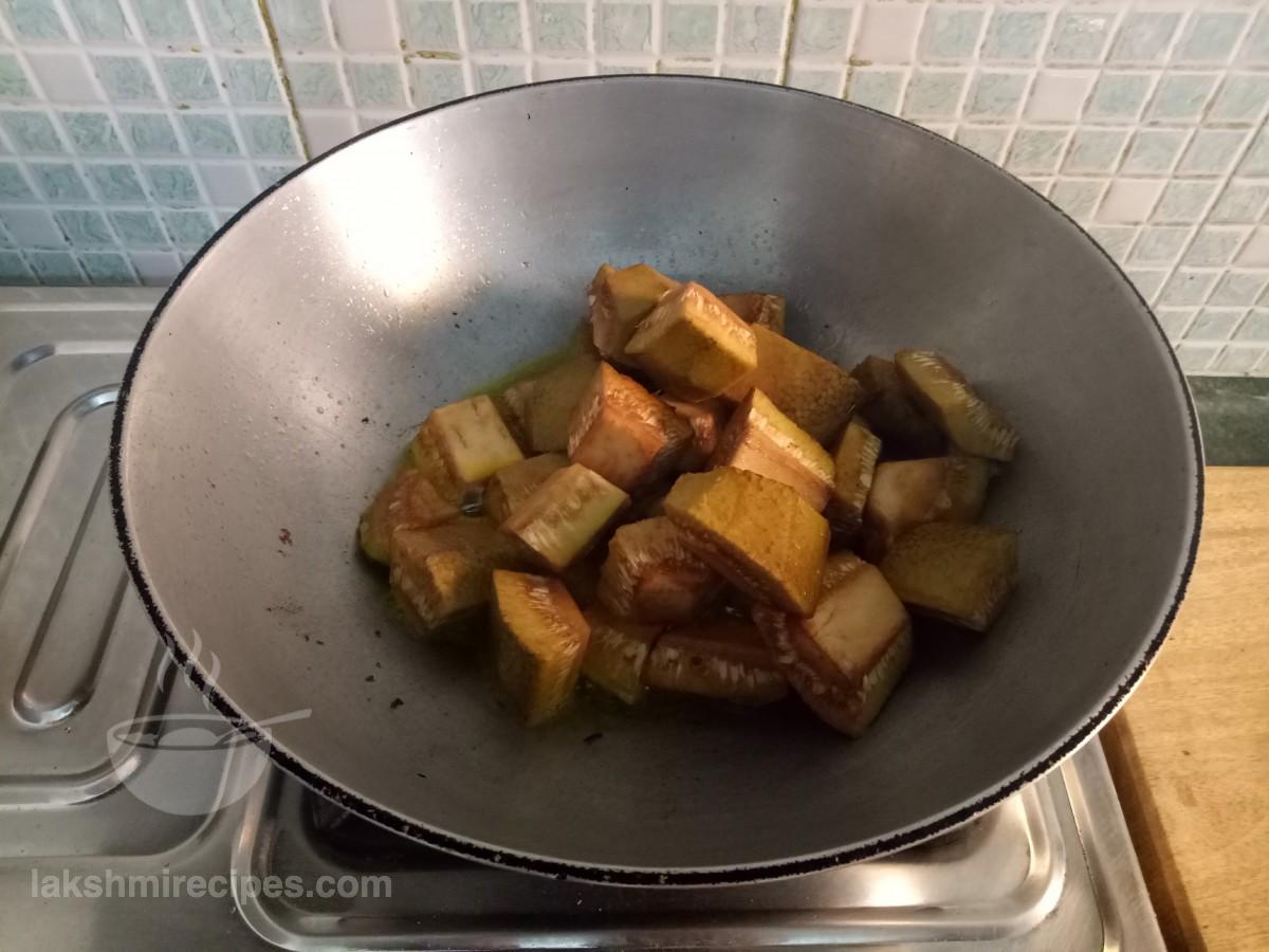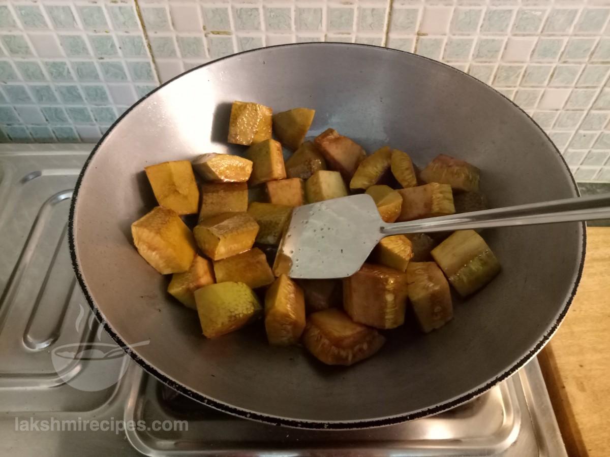 - अब कटहल के टुकड़ों को उसी कढ़ाई में डालकर भूनें। कटहल के टुकड़ों को तब तक भूनें जब तक वे सुनहरे लाल रंग के न हो जाएं। कटहल के तले हुए टुकड़ों को बाद में उपयोग किए जाने के लिए एक प्लेट में स्थानांतरित करें।