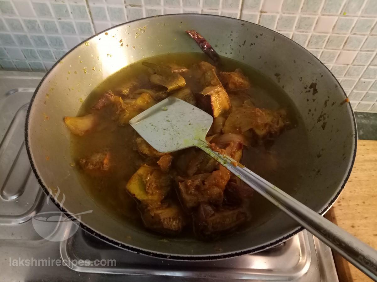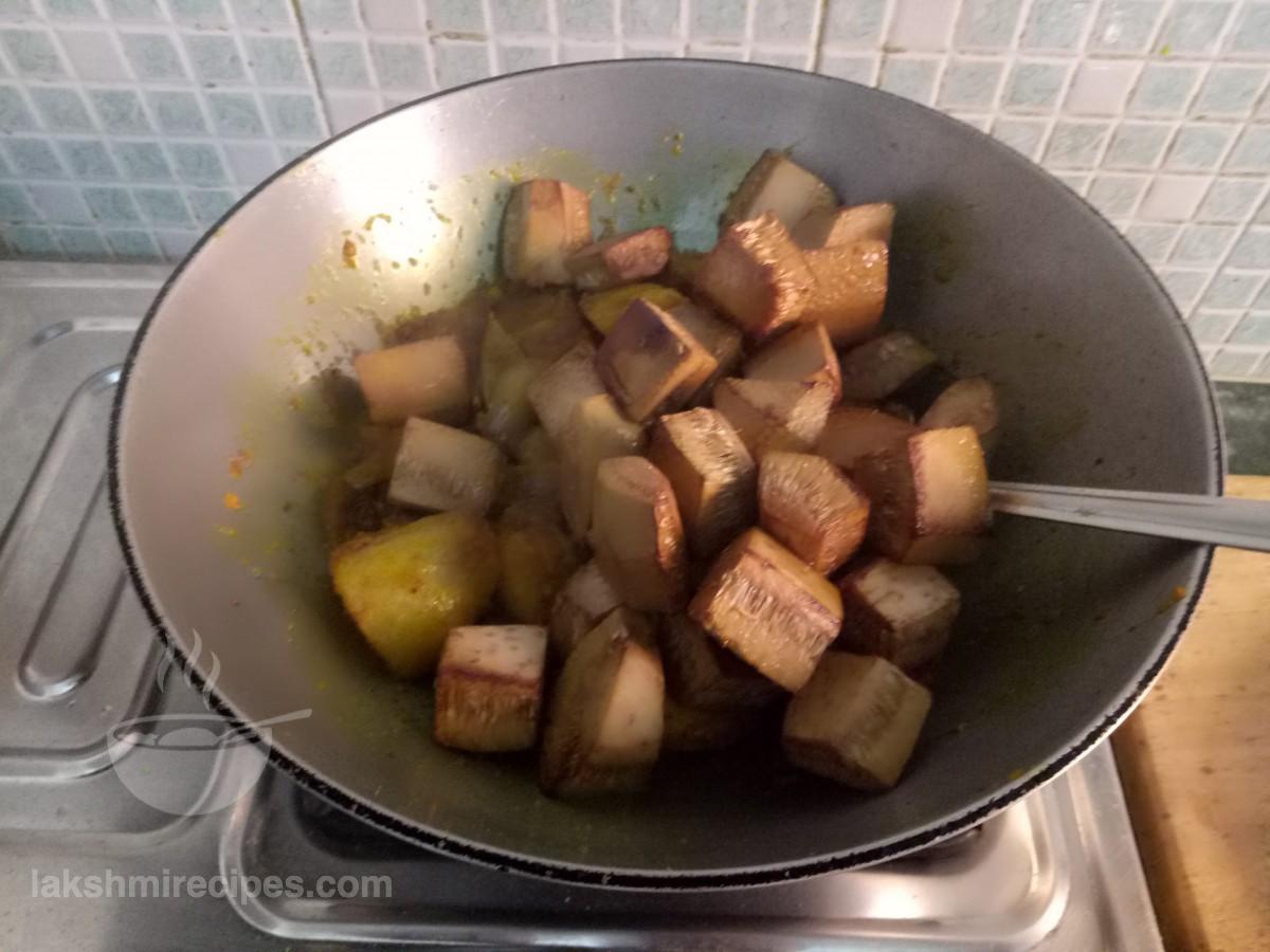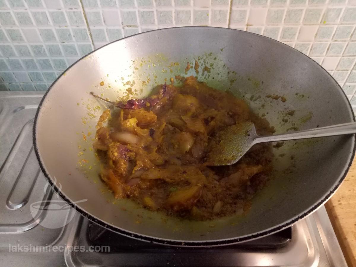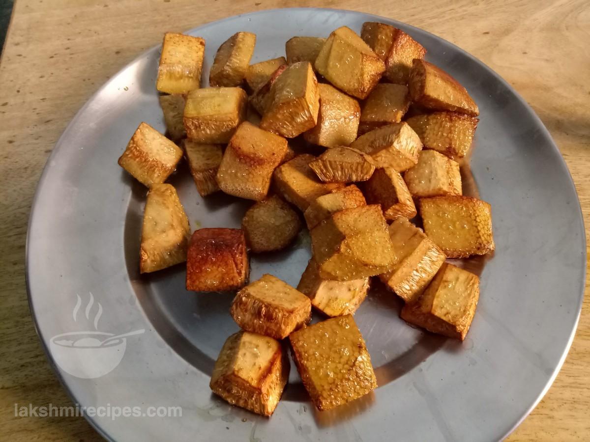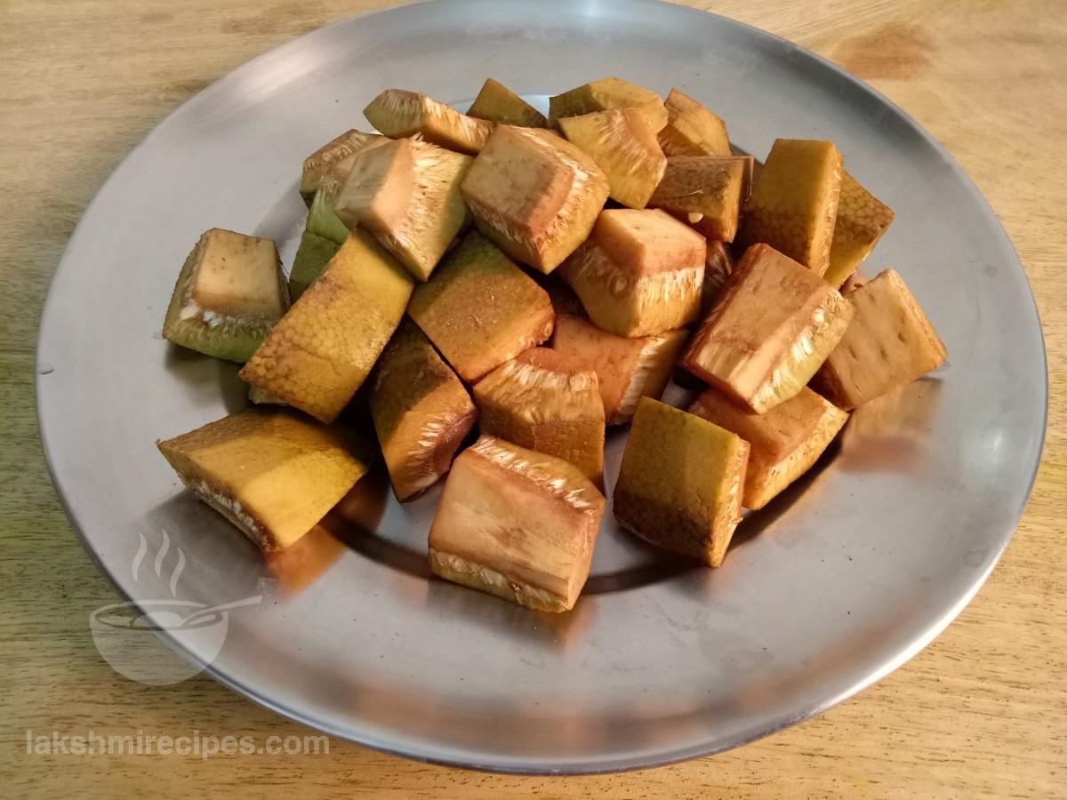 - अब कटहल के टुकड़ों को उसी कढ़ाई में डालकर भूनें। कटहल के टुकड़ों को तब तक भूनें जब तक वे सुनहरे लाल रंग के न हो जाएं। कटहल के तले हुए टुकड़ों को बाद में उपयोग किए जाने के लिए एक प्लेट में स्थानांतरित करें।