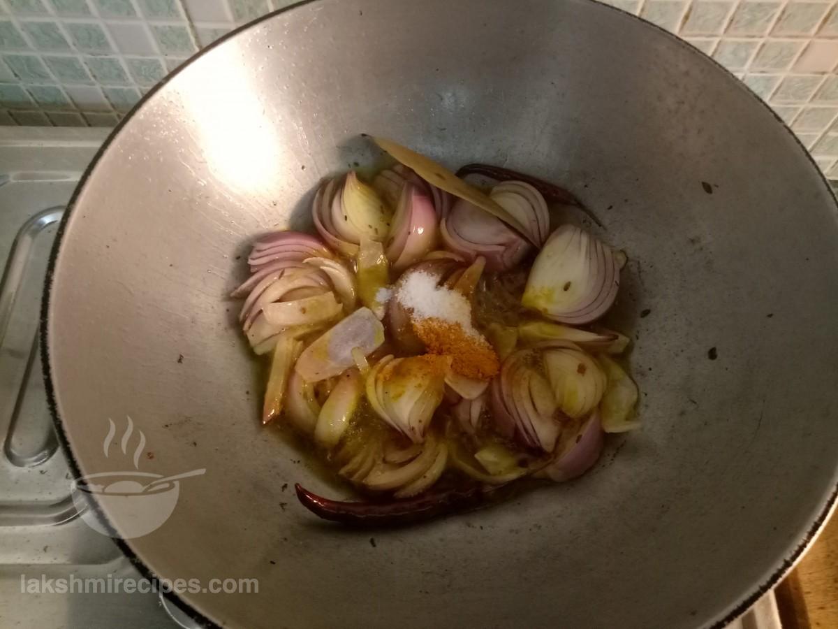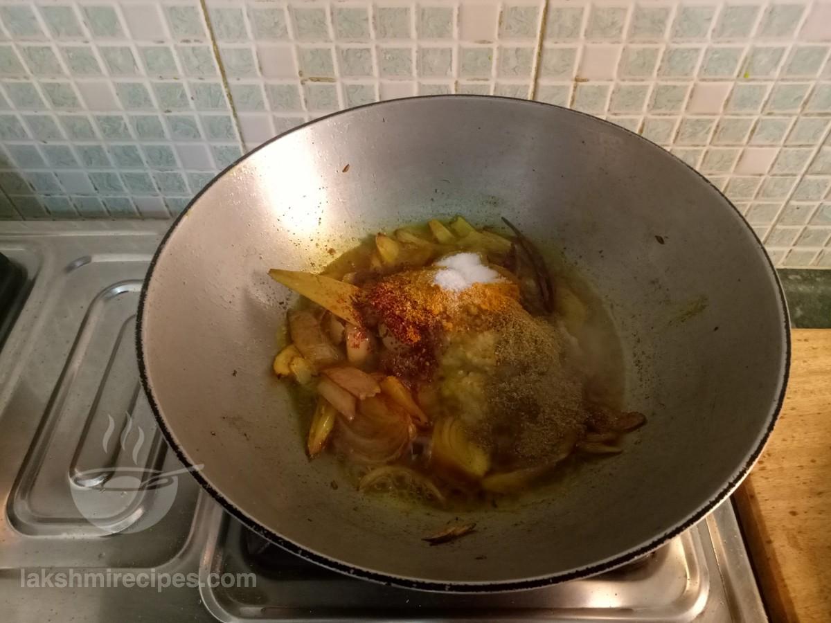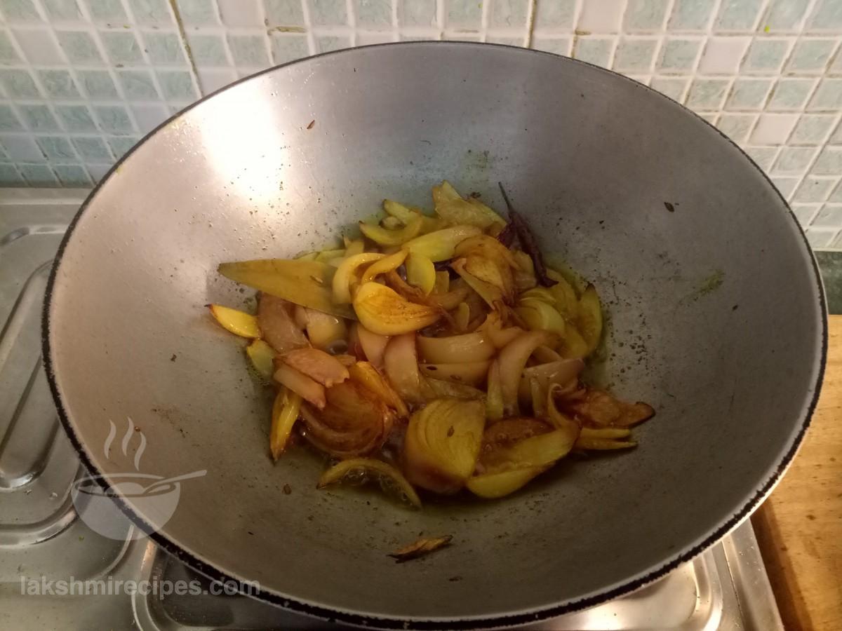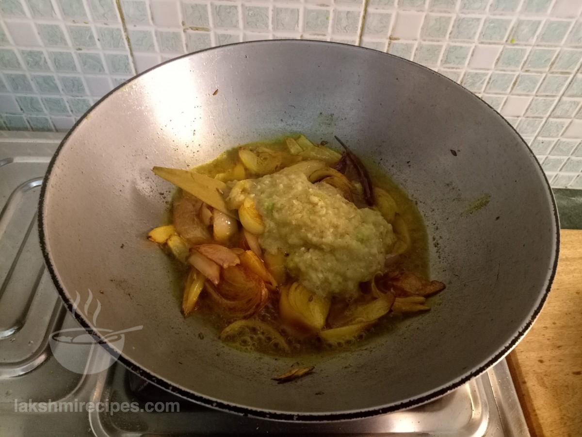- आँच को मध्यम स्तर तक कम करें और कुछ समय के लिए प्याज के टुकड़ों को इस तरह पकाने दें और फिर प्याज-अदरक-लहसुन-हरी मिर्च का पेस्ट (जो कि चरण 5 में तैयार किया गया था) उसे भी डालें।