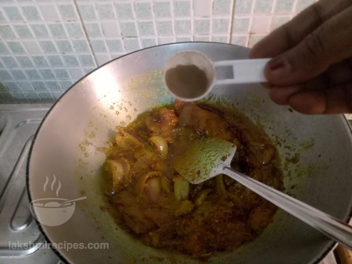 - Then add garam masala powder to the kadhai and mix with the cooking masala.