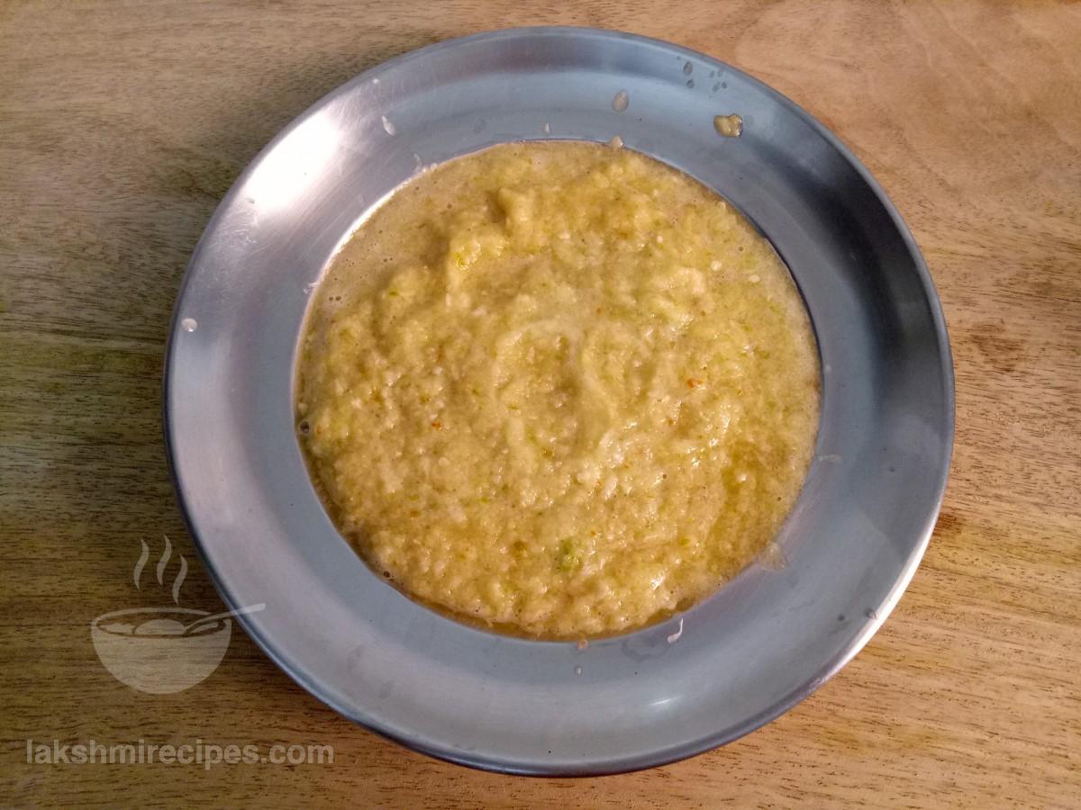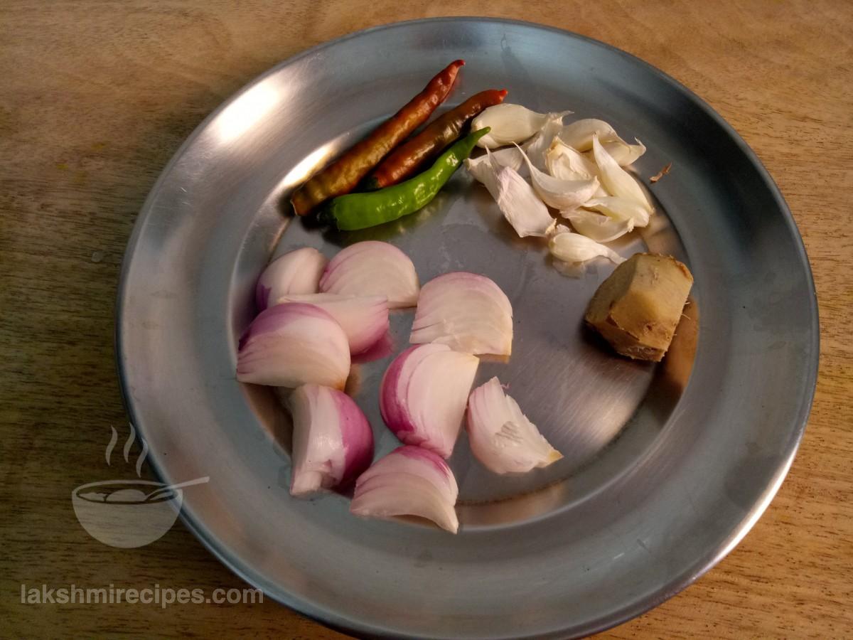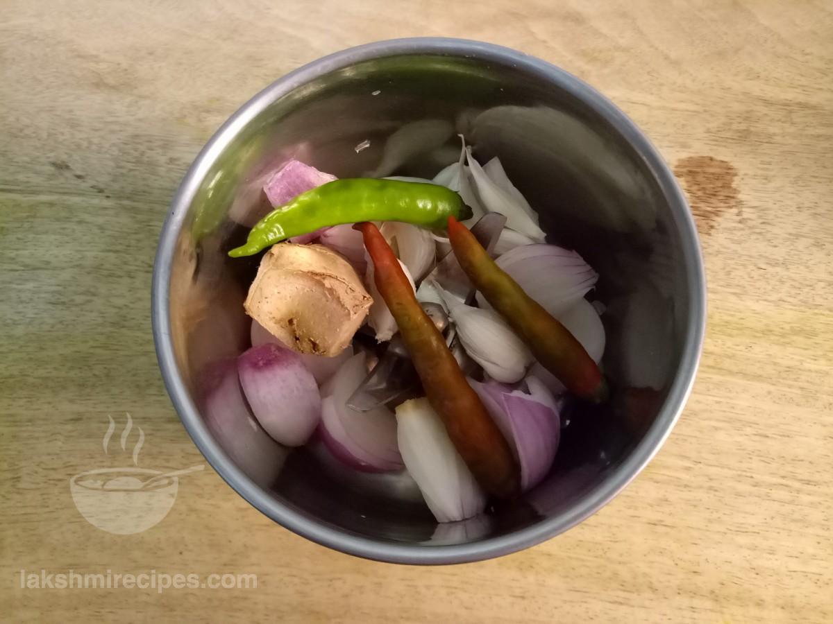 - Then take a mixer jar and add ginger, garlic petals, green chilli and few onion slices to it. Add 2-3 table spoon water to the mixer jar and grind the ingredients to form a fine paste.