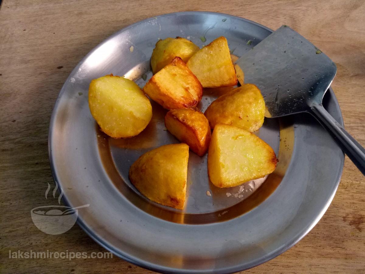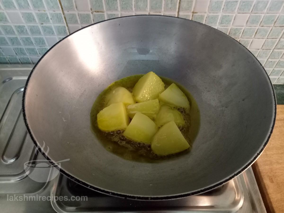- अब एक कढ़ाई गरम करें और इसमें सरसों का तेल डालें। जब तेल तलने के लिए पर्याप्त गर्म होजाए तो उसमें उबले हुआ आलू के टुकड़े डालें। उबले हुए आलू के टुकड़ों को चलाते हुए तलें, जब तक कि वे सभी तरफ से सुनहरे लाल रंग के न हो जाएं। तले हुए उबले आलू के टुकड़ों को एक प्लेट में बाद में इस्तेमाल करने के लिए स्थानांतरित करें।