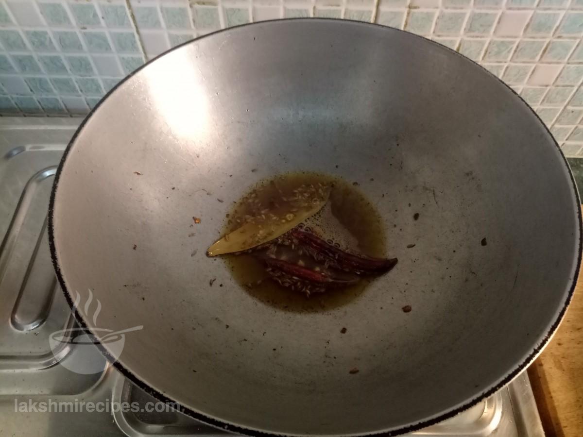 - After a few seconds add cumin seeds, whole dried red chillis and one bay leaf to the kadhai.