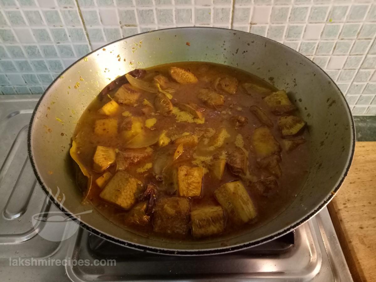 - अब कटहल के तले हुए टुकड़ों को और तले हुए उबले आलू के टुकड़ों को मसाले में जोड़ें। मसाला के साथ अच्छे से चलाकर मिलाएं और फिर जितनी पतली ग्रेवी रखनी है उसके अनुसार कढ़ाई में पानी जोड़ें। अच्छी तरह से सामग्री मिलाएं।