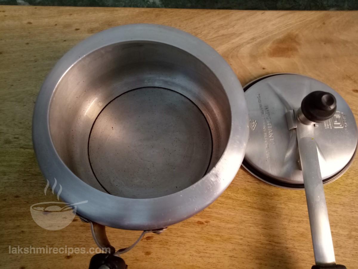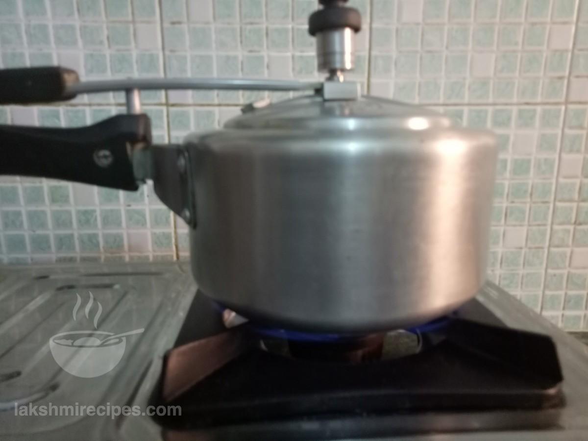 - Then transfer then ingredients of the kadhai to a pressure cooker and cover the cooker with its lid. Pressure cook the ingredients for 2-3 whistles over high flame and then turn off the flame.