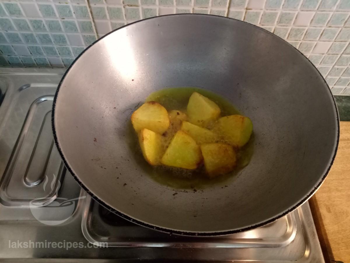 - Now heat a kadhai and add mustard oil to it. When the oil is hot enough for frying then add pieces of boiled potato to it. Fry the pieces of boiled potato till it turns golden red in color on all sides. Transfer the fried pieces of boiled potato to a plate to be used later.