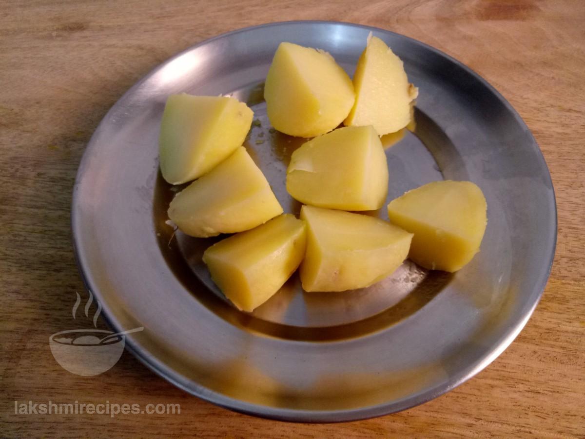 - Now peel off the boiled potatoes and cut them in equal sized big pieces (as shown in the image below).