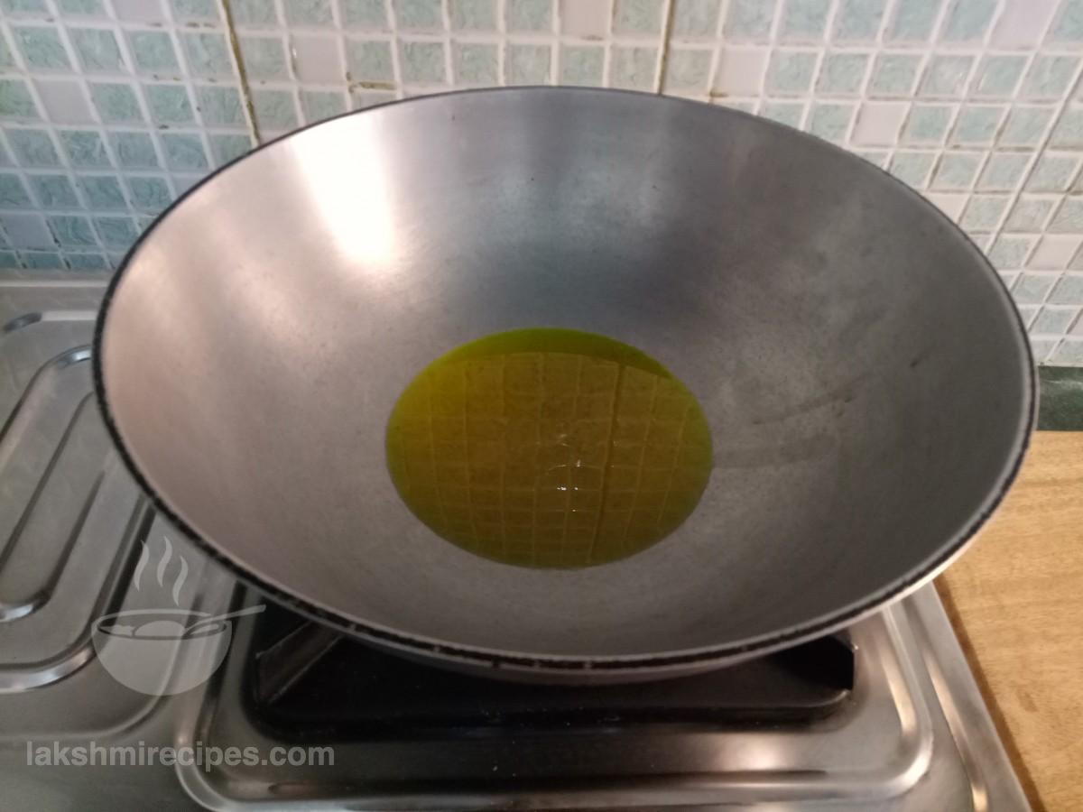 - In the same kadhai add more oil if need and then add 1 pinch asafoetida (hing) to it.