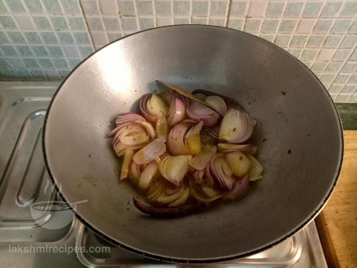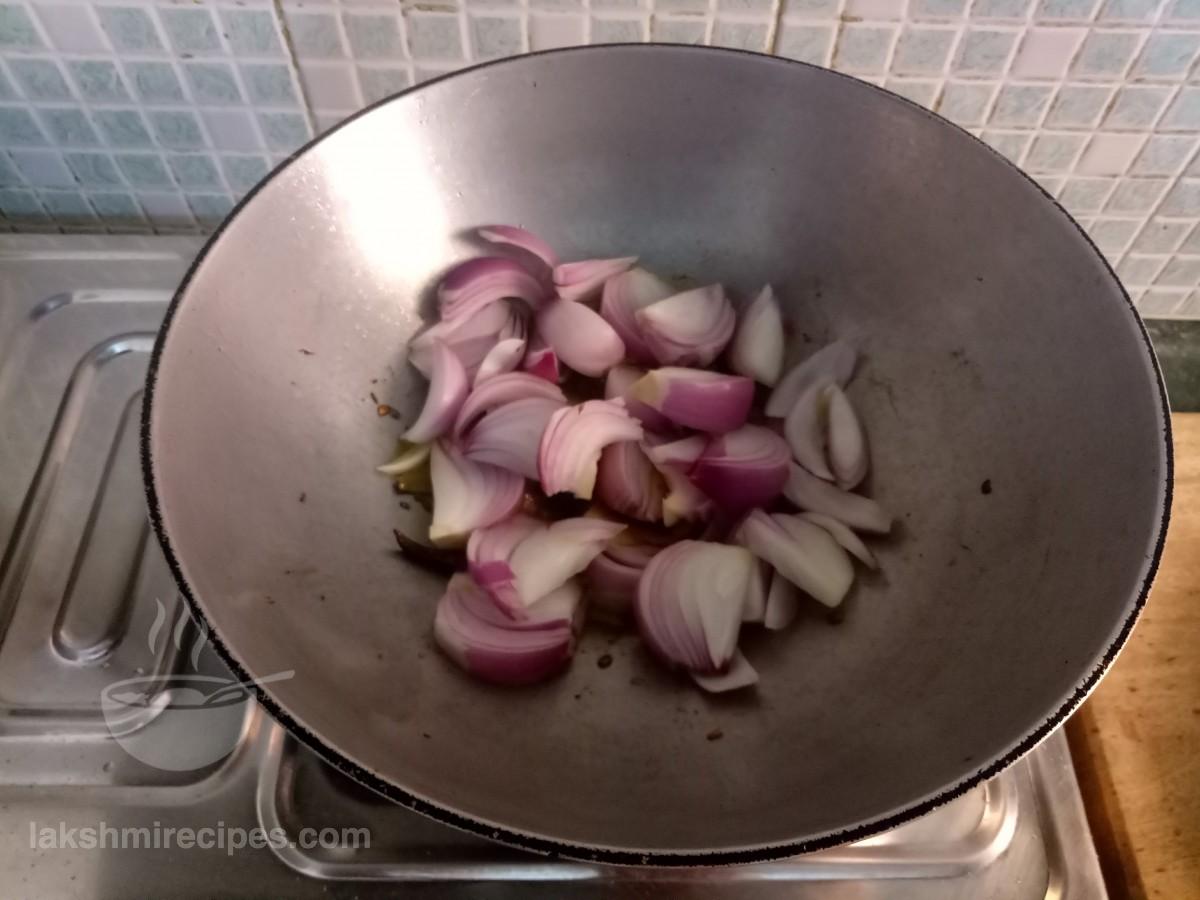 - Lower the flame to medium level and allow the onion pieces to cook like this for some time and then add the paste of onion-ginger-garlic-green chilli prepared in step 5 to it.