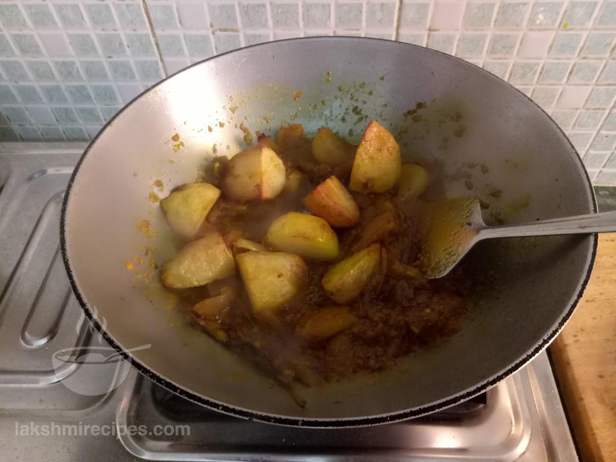 - Now add the fried pieces of Jackfruit or Kathal and boiled potatoes to the kadhai. Stir and mix with the masala.