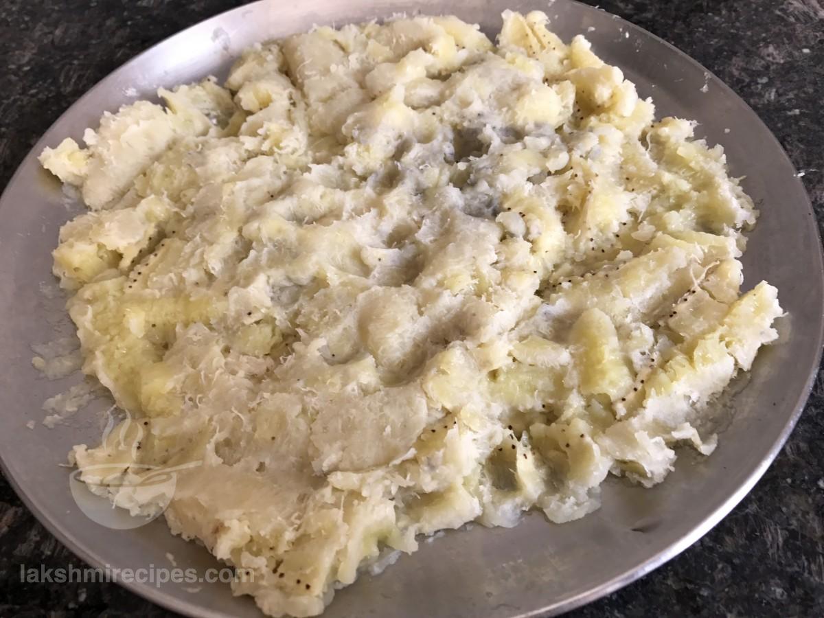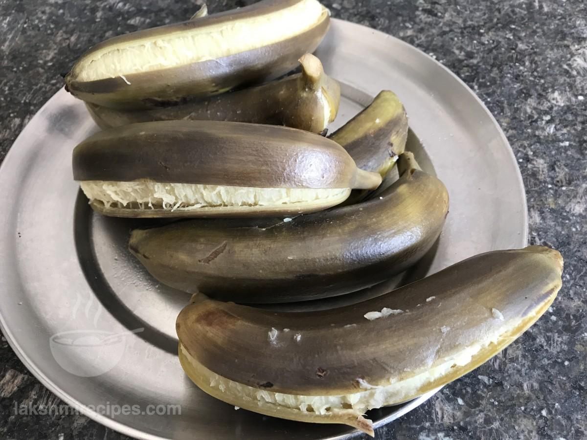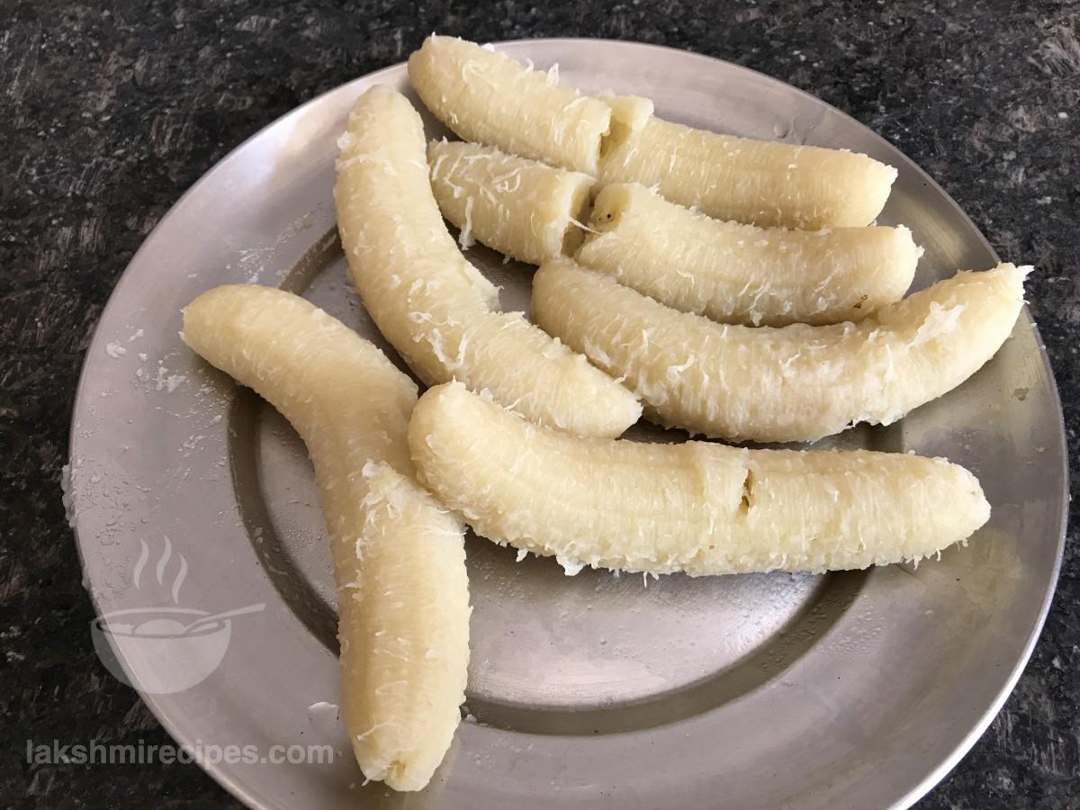 - और पतीले या कढ़ाई से नरम और पके हुए केलों को निकाल कर एक बड़ी प्लेट में रखें और उन्हें ठंडा होने दें।