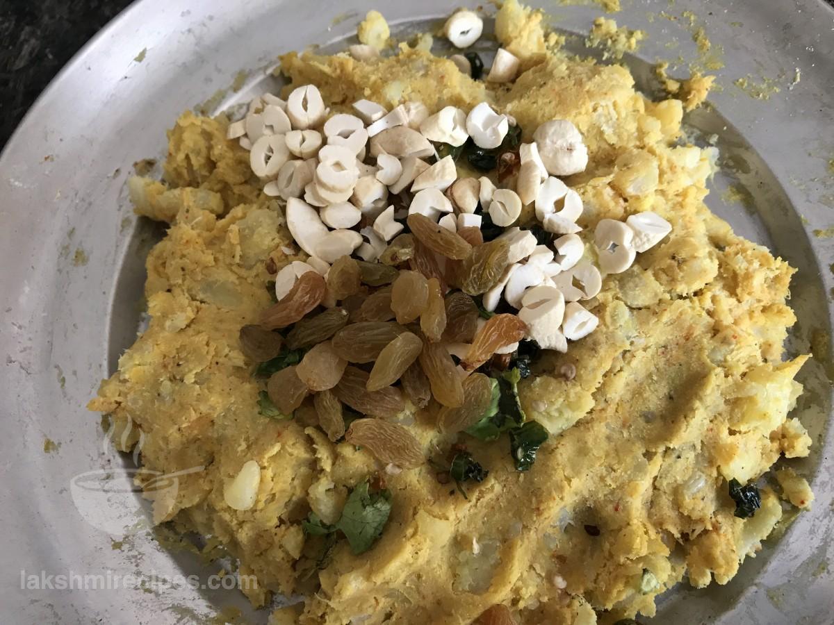 - फिर इसमें कटी हुई धनिया पत्ती, हरी मिर्च, काजू और किशमिश डालें। फिर से अच्छी तरह से मिलाएं।