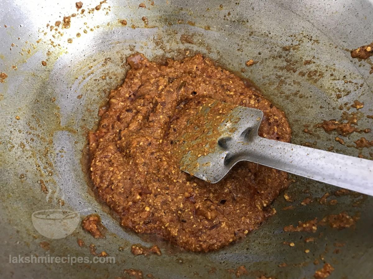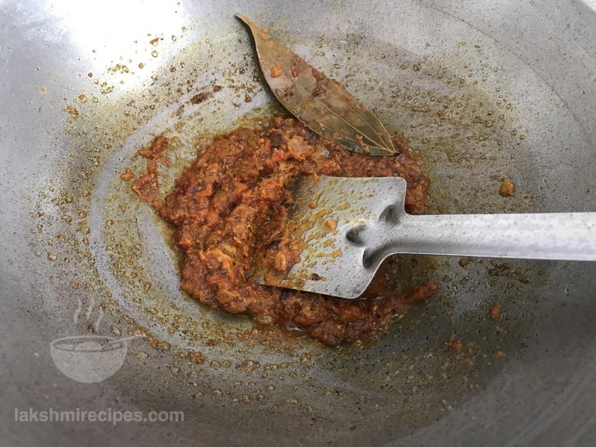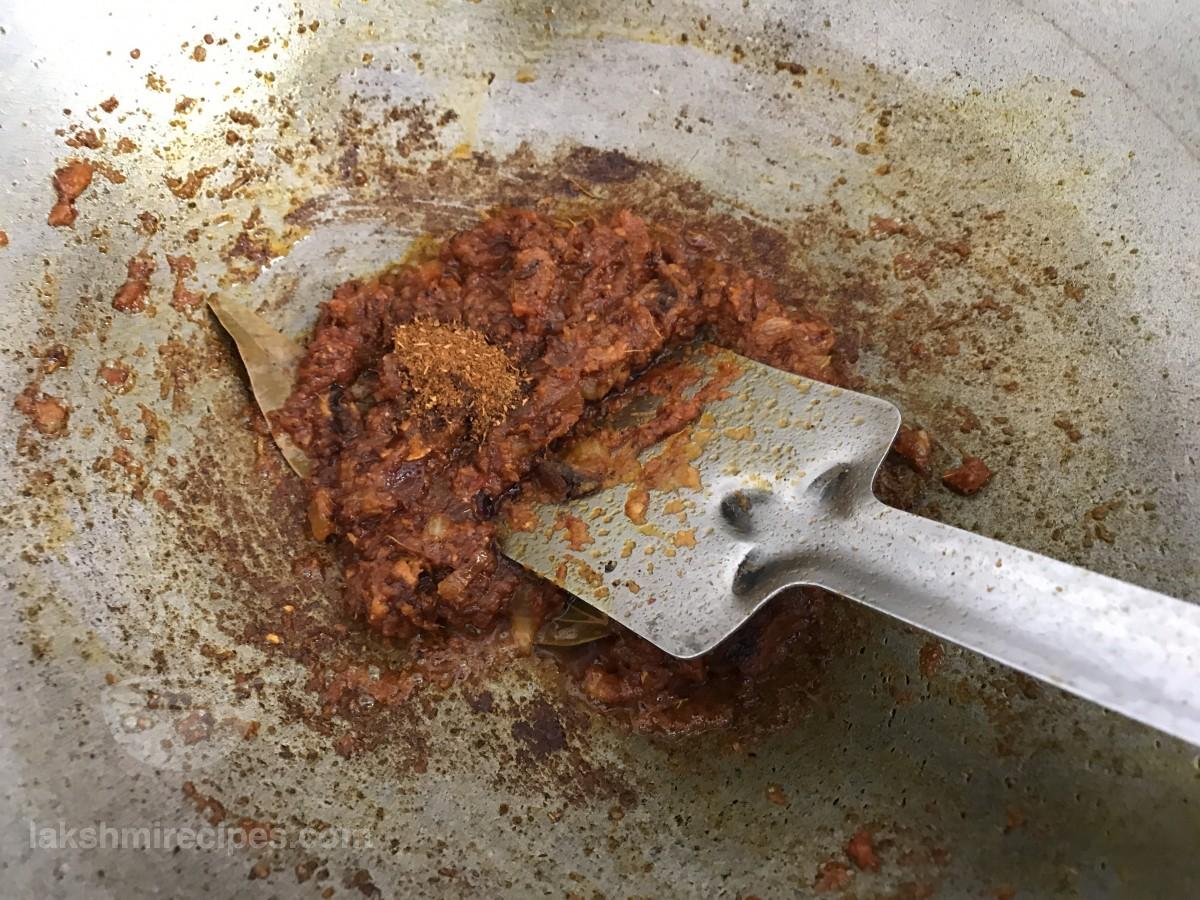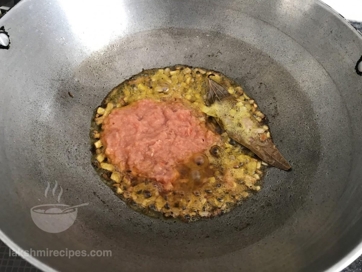 - Then add tomato-garlic-ginger-green chilli paste to the kadhai and mix with the cooking ingredients in the kadhai.