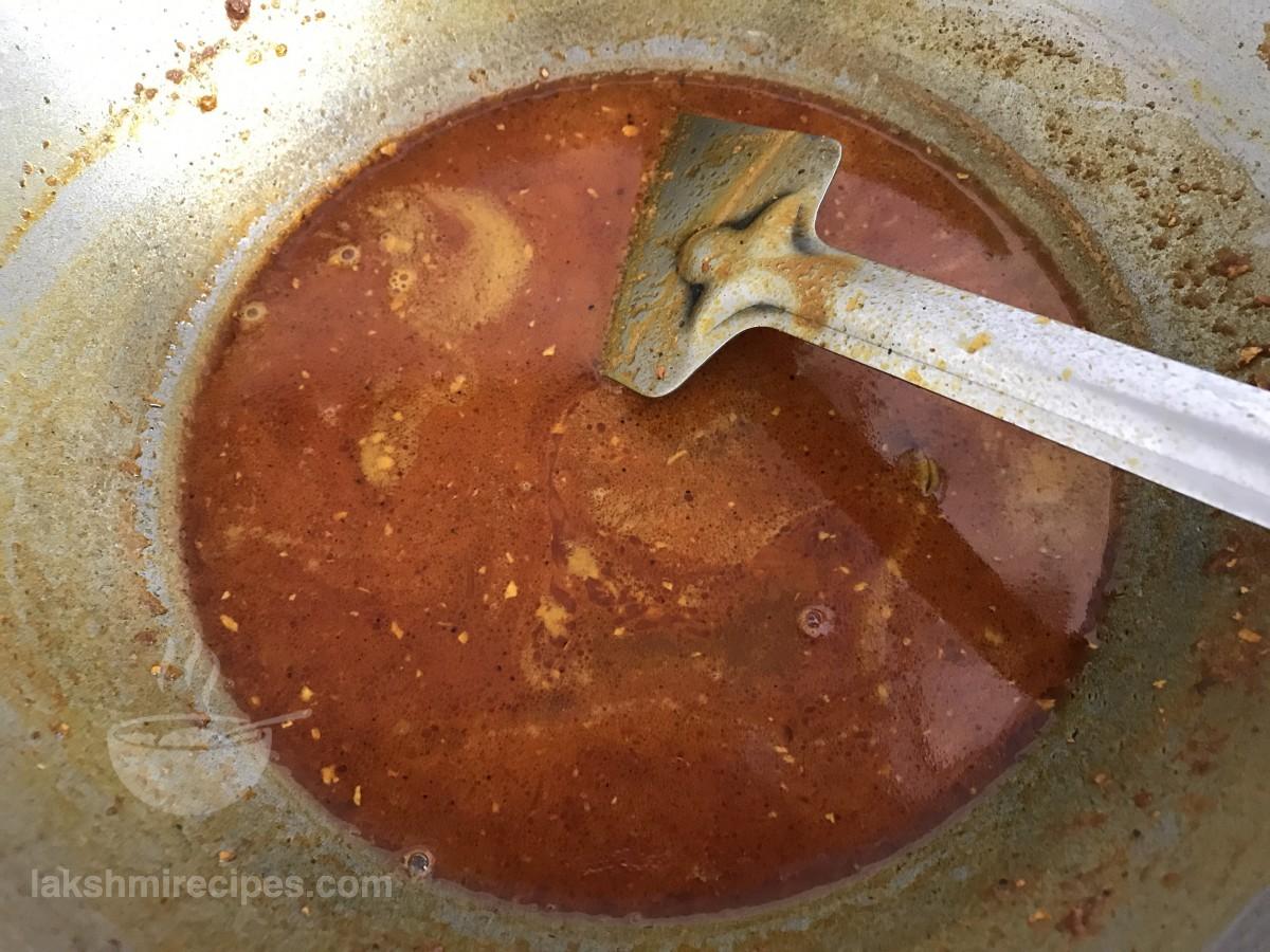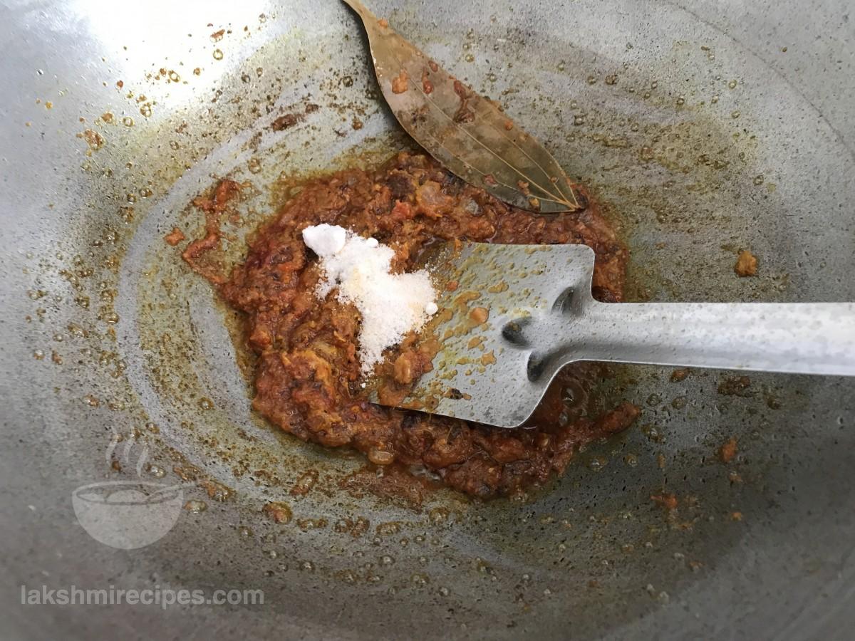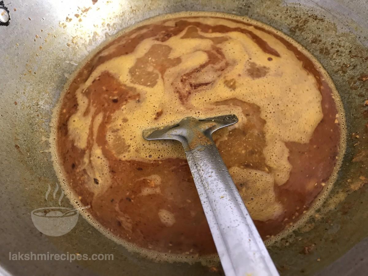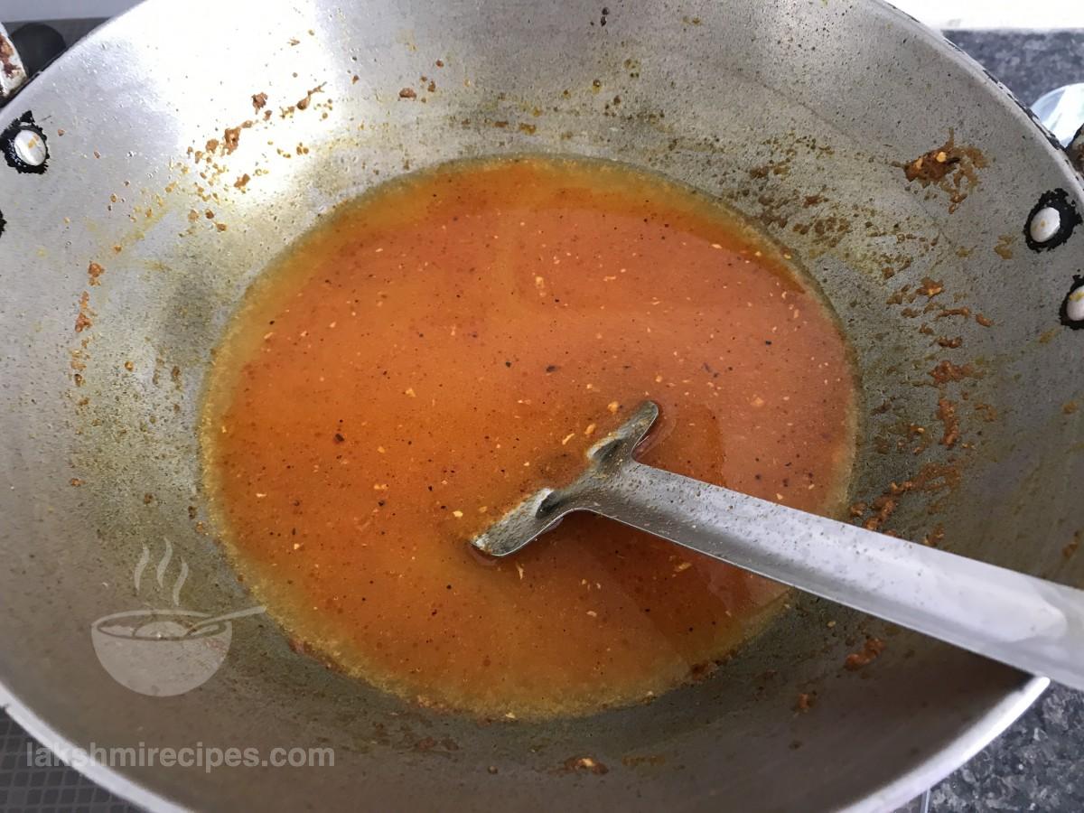 - Then add tomato-garlic-ginger-green chilli paste to the kadhai and mix with the cooking ingredients in the kadhai.