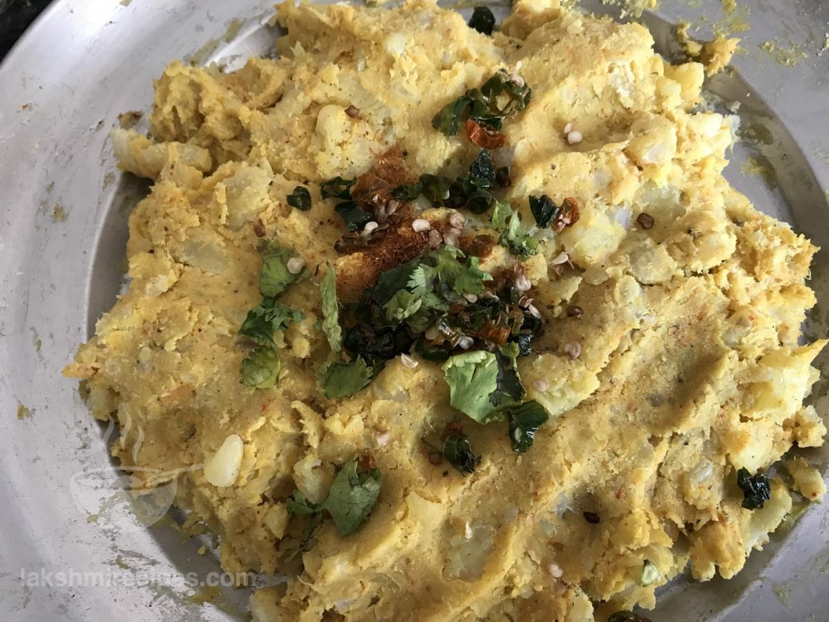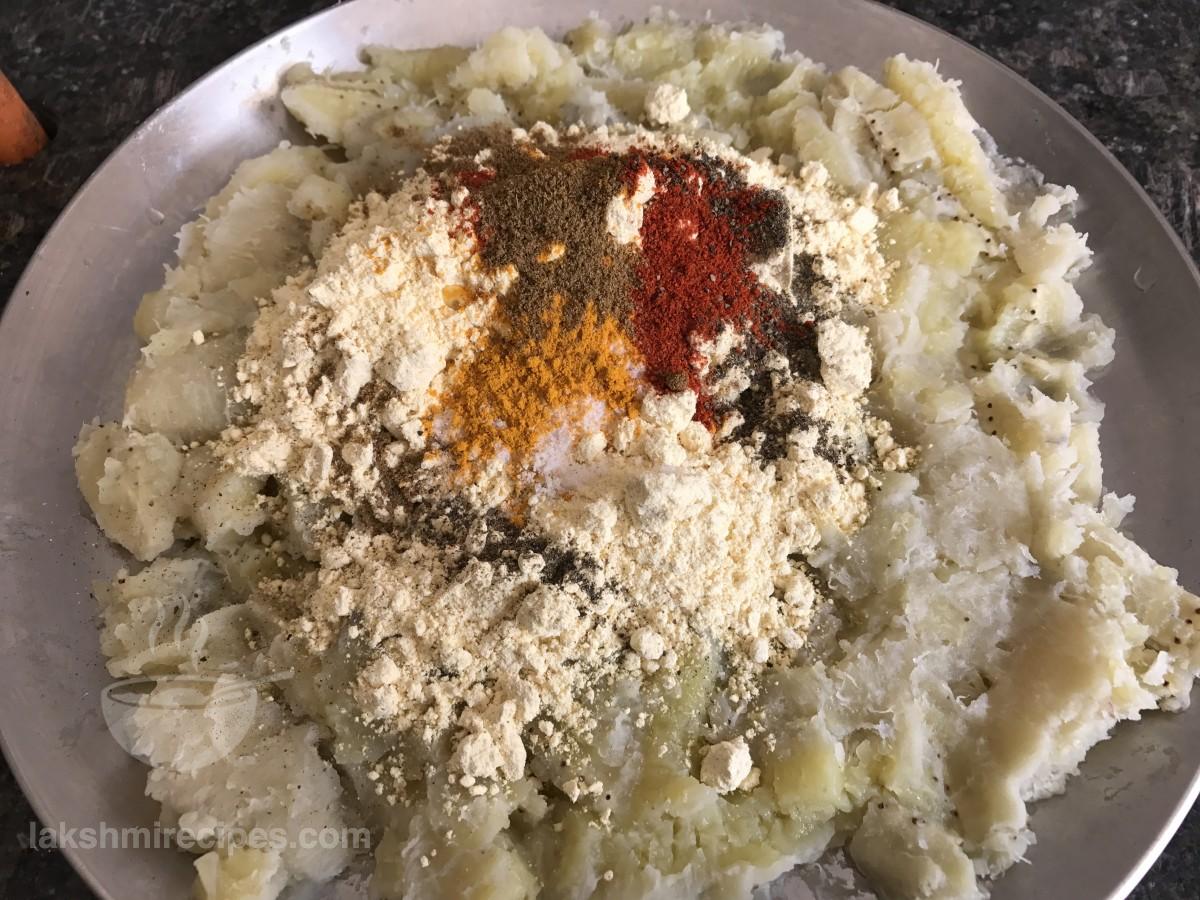 - Now add gram flour, powder spices (turmeric powder, red chilli powder, cumin seeds powder, black pepper powder and garam masala powder) and salt to the mashed bananas. Mix all the ingredients well.