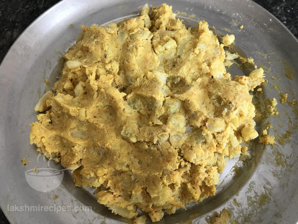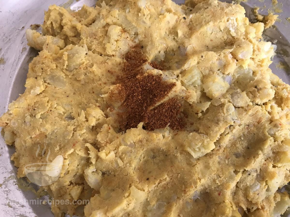 - अब मैश किये हुए केलों में बेसन, पाउडर मसाले (हल्दी पाउडर, लाल मिर्च पाउडर, जीरा पाउडर, काली मिर्च पाउडर और गरम मसाला पाउडर) और नमक डालें। सारी सामग्री को अच्छी तरह से मिलाएं।