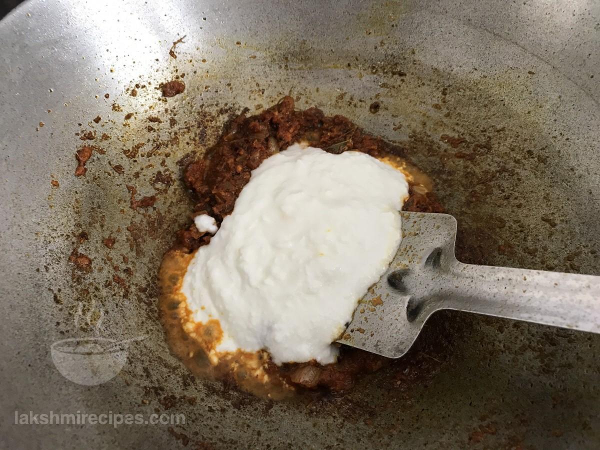 - Then add garam masala powder and 1 small cup curd to the kadhai. Stir well to mix the ingredients so that no lumps are formed.