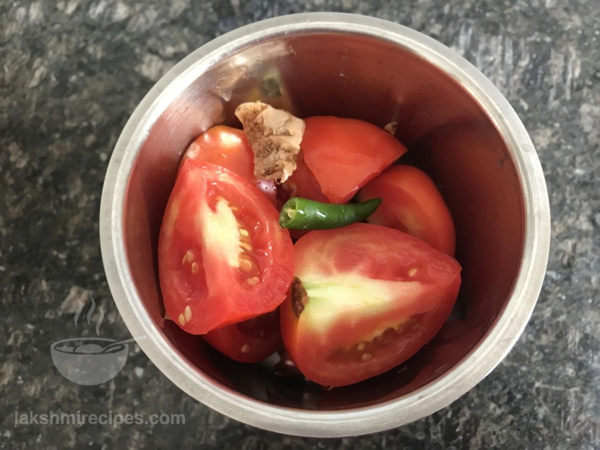 - फिर टमाटर, लहसुन, अदरक और हरी मिर्च को एक मिक्सर जार में डालें और एक साथ पीस कर बारीक पेस्ट बना लें।