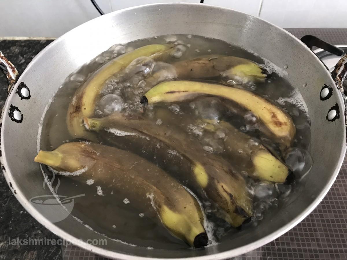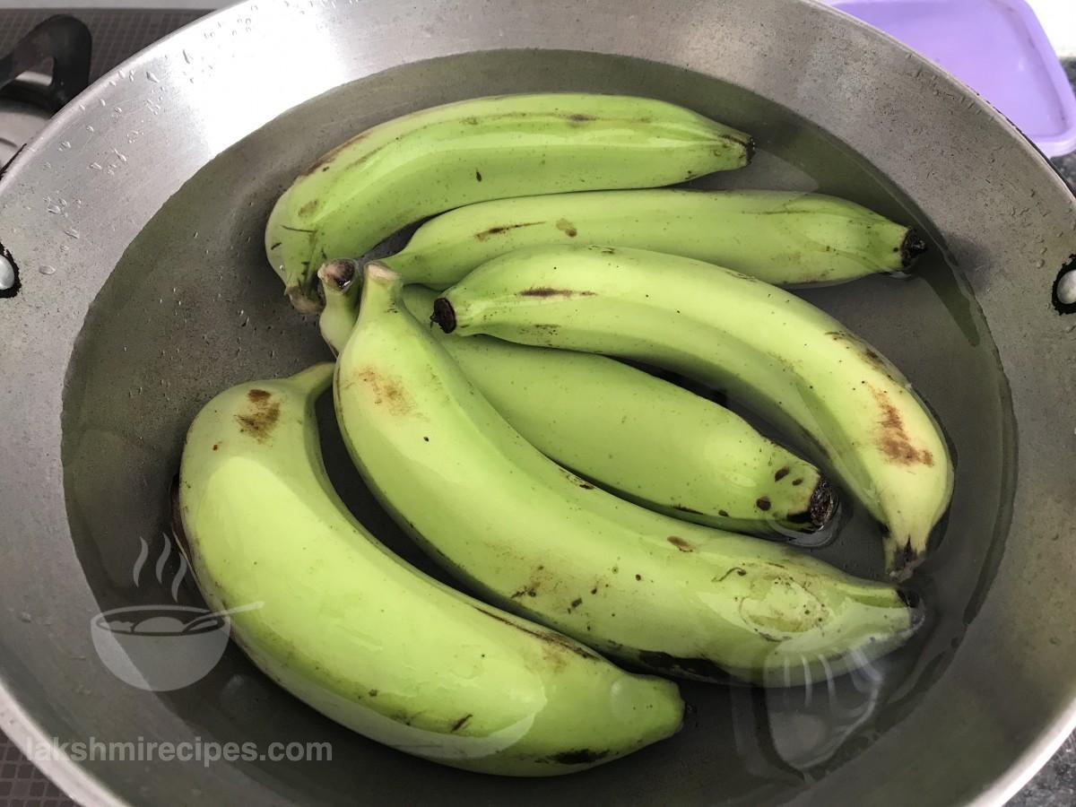 - कच्चे केलों को साफ पानी से धो लें और फिर उन्हें पानी से भरे हुए एक बड़े पतीले या कढ़ाई में डालें।