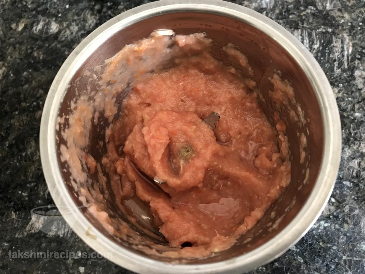 - Then take tomato, garlic, ginger and green chilli to a mixer jar and grind them together to form a fine paste.