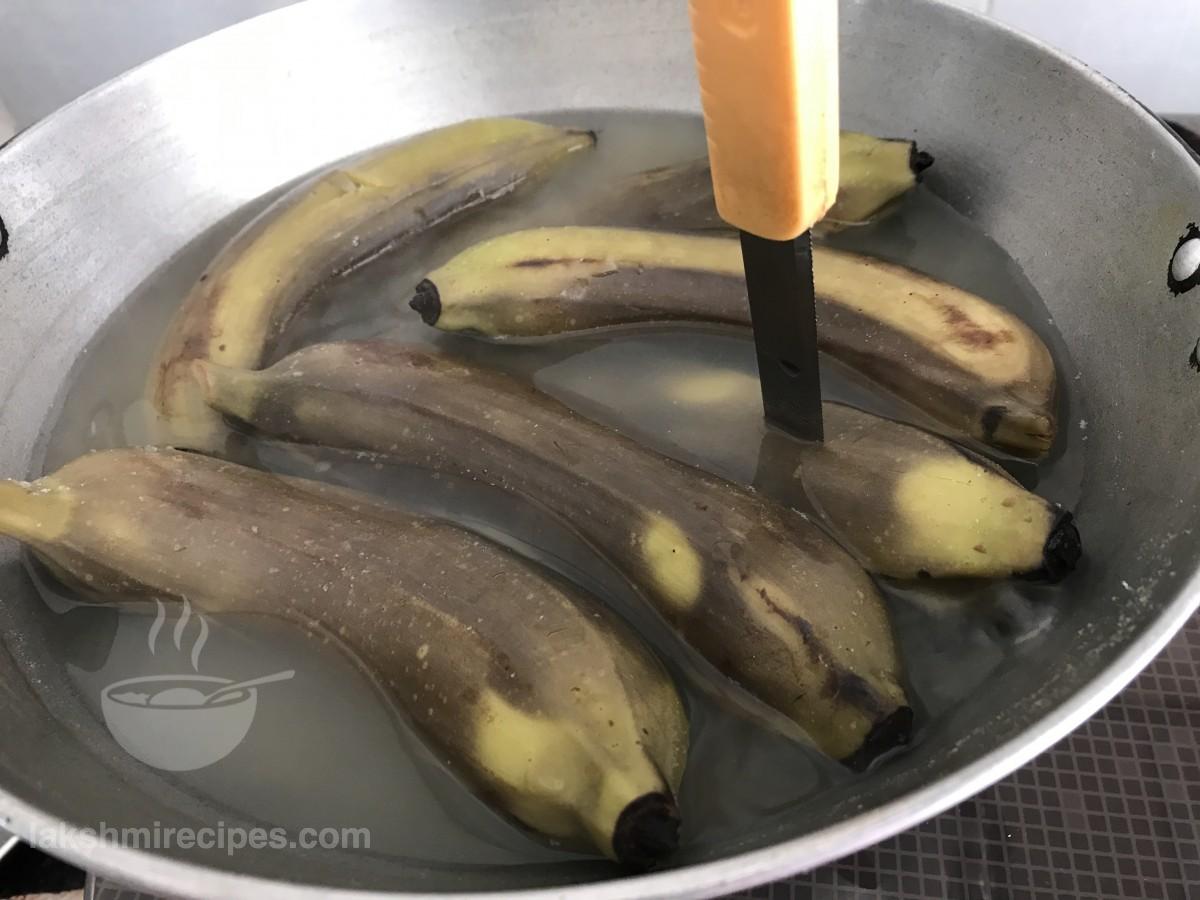 - कुछ समय बाद पतीले या कढ़ाई से ढक्कन को हटा दें और केलों में चाकू डालकर देखें कि केले पक कर और नरम हो गए हैं या नहीं। यदि केले अभी भी कच्चे लगें हैं तो कुछ और समय के लिए केलों को उसी तरीके से पकने दें। फिर गैस बंद कर दें