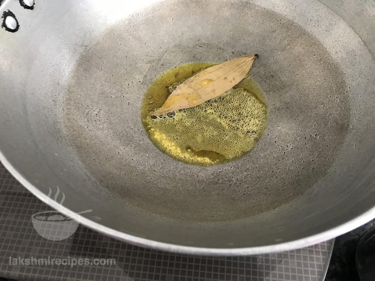 - When the oil is hot enough for cooking then add asafoetida, a bay leaf and 1 tea spoon cumin seeds to it. Allow the cumin seeds o crackle.