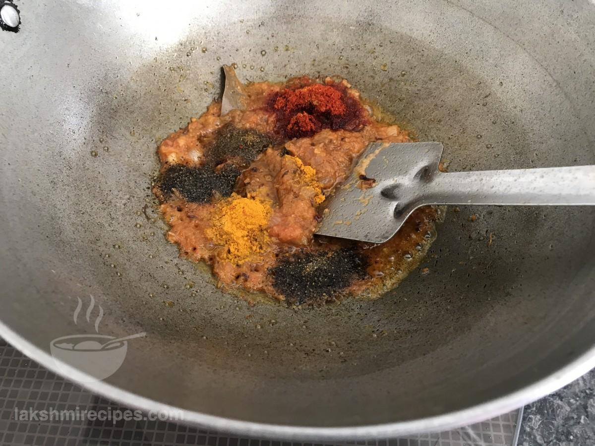 - अब इसमें सारे पाउडर मसाले (हल्दी पाउडर, लाल मिर्च पाउडर, जीरा पाउडर, धनिया पाउडर, काली मिर्च पाउडर) और नमक डालें। मसालों से तेल अलग होने तक मसालों को भूनें।