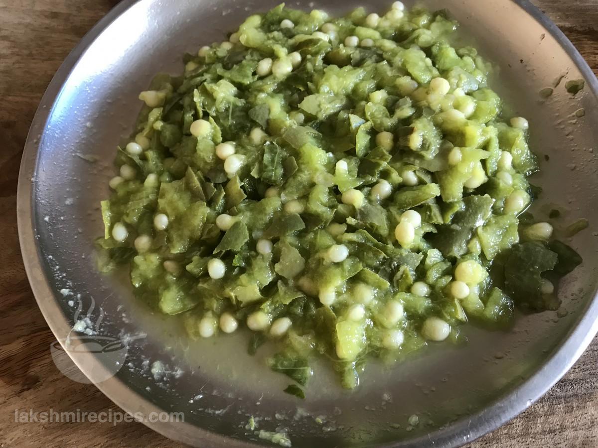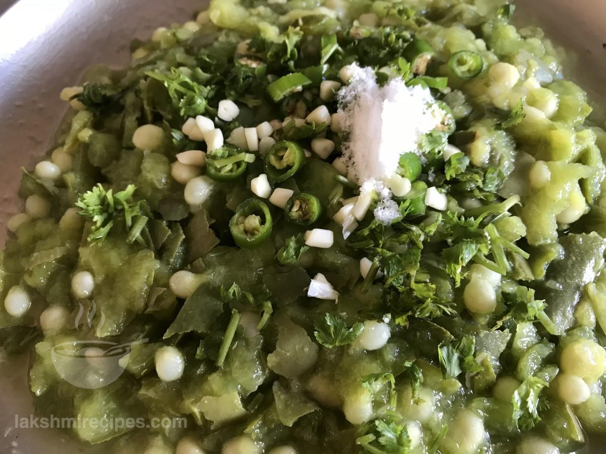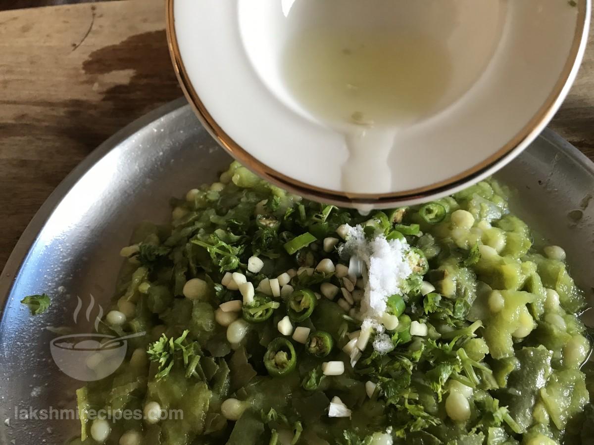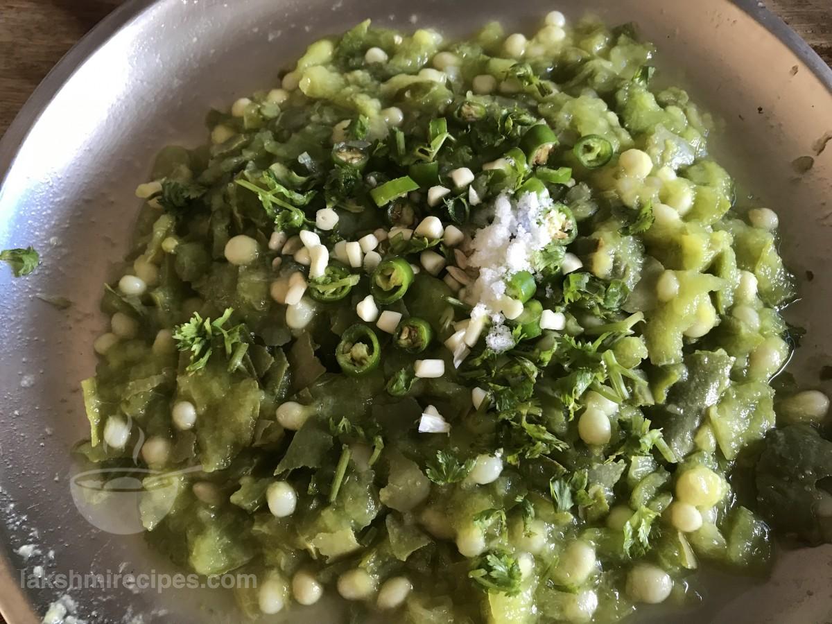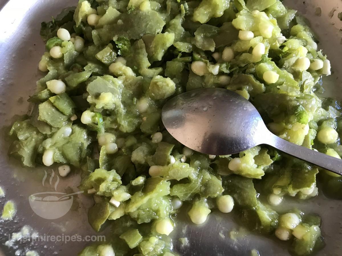 - Then mash these boiled pointed gourds or parwal, and add chopped green chilli, garlic and coriander leaves.