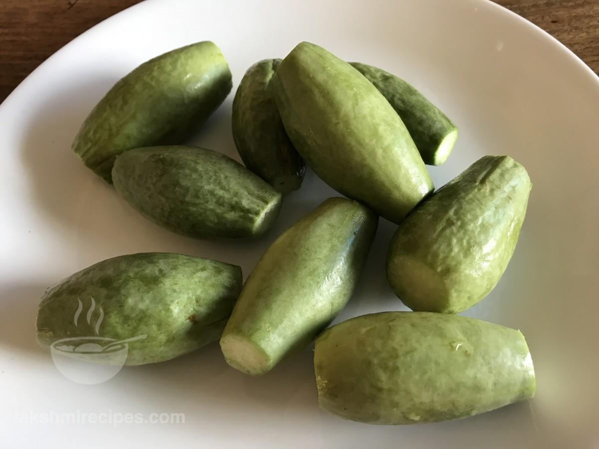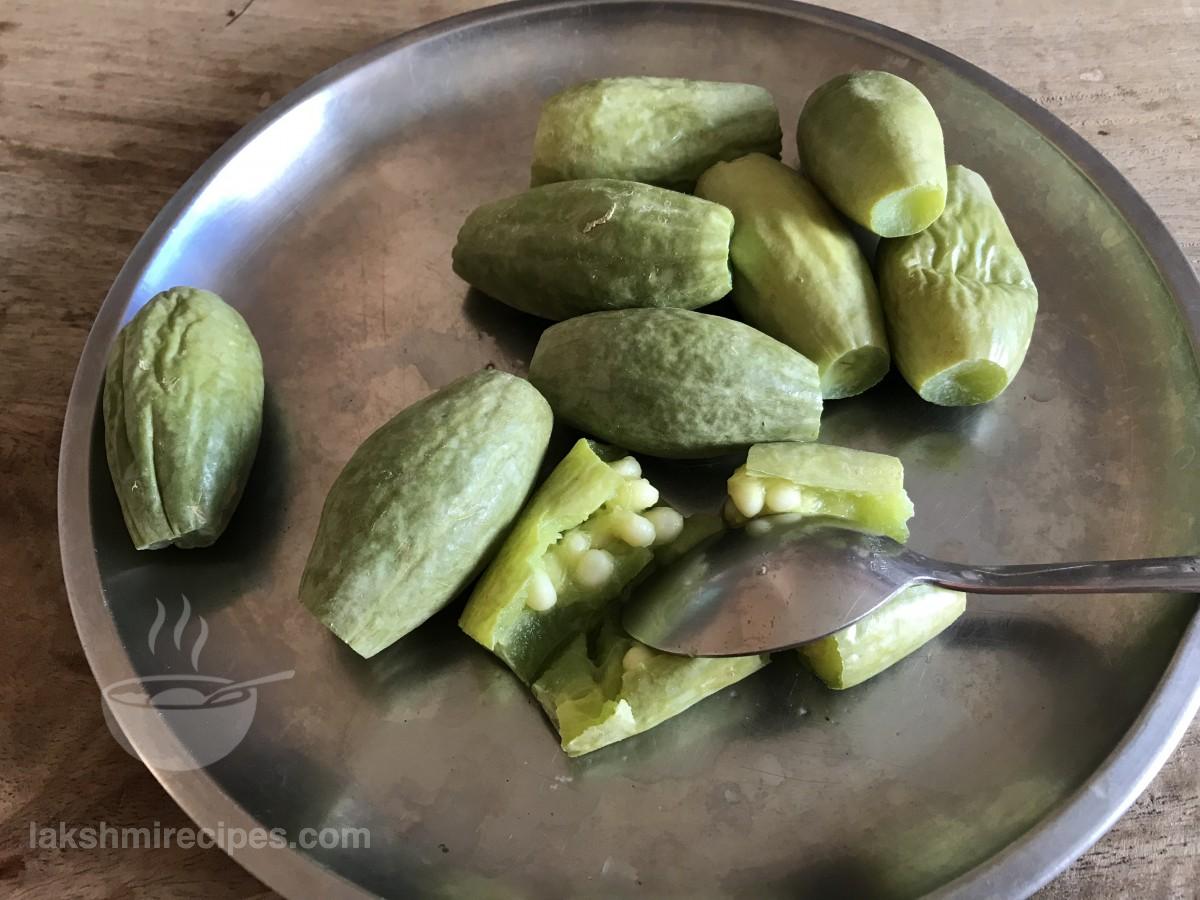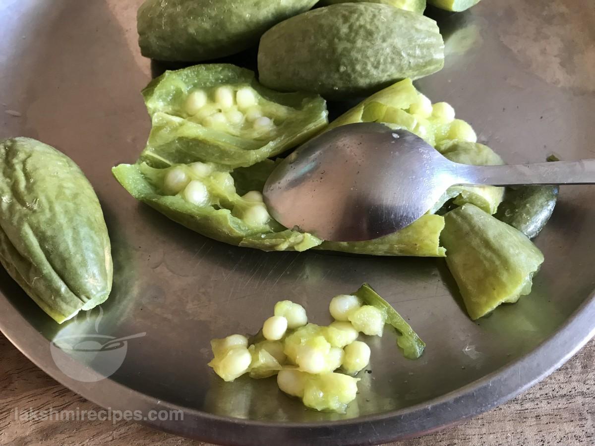 - When the pressure cooker is cooled, then remove the lid and take out the pointed gourds or parwal. Remove a few seeds and leave the remaining.