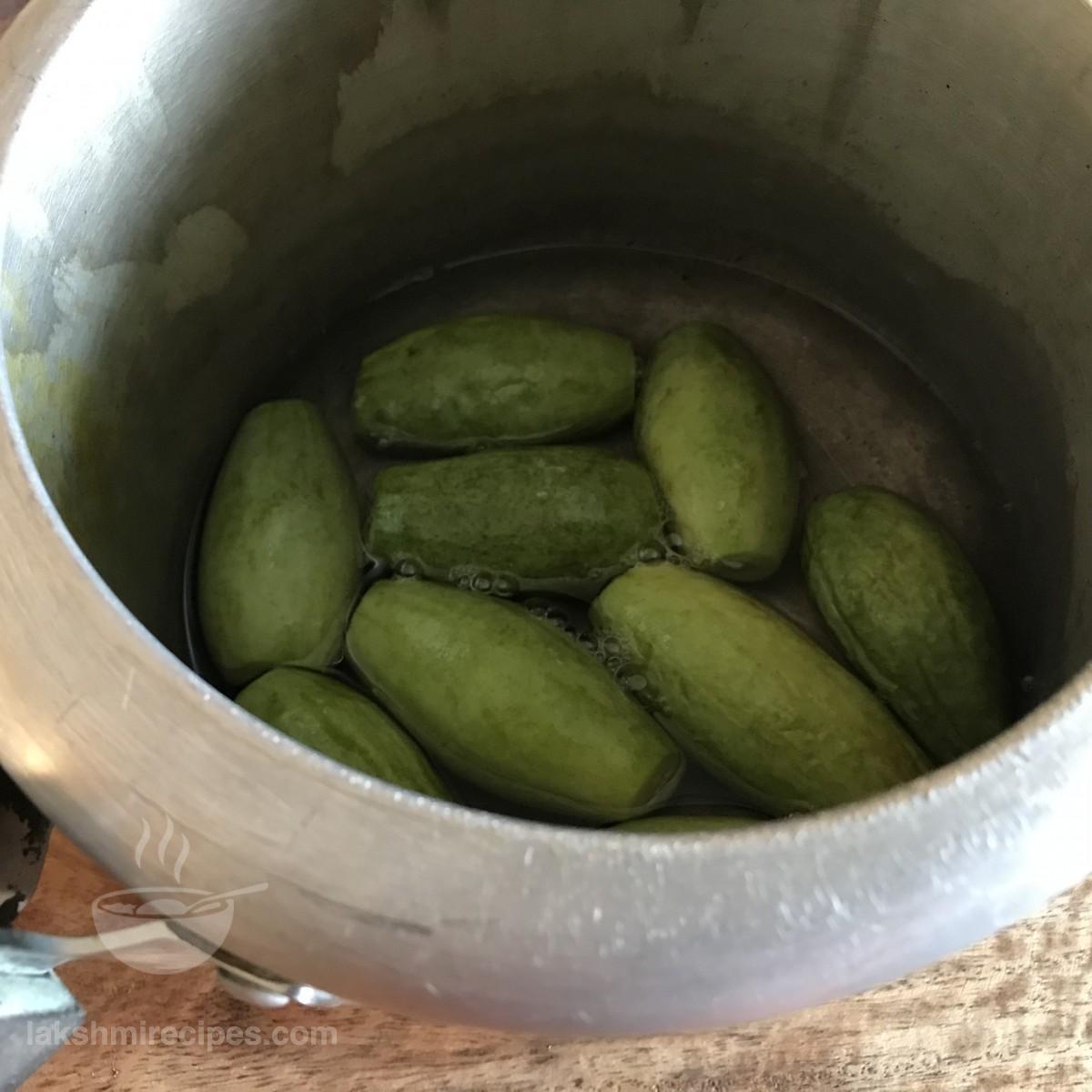 - Transfer these pointed gourds or parwal to a pressure cooker and add 1 small cup water to it. Then pressure cook these pointed gourds or parwal for one whistle.