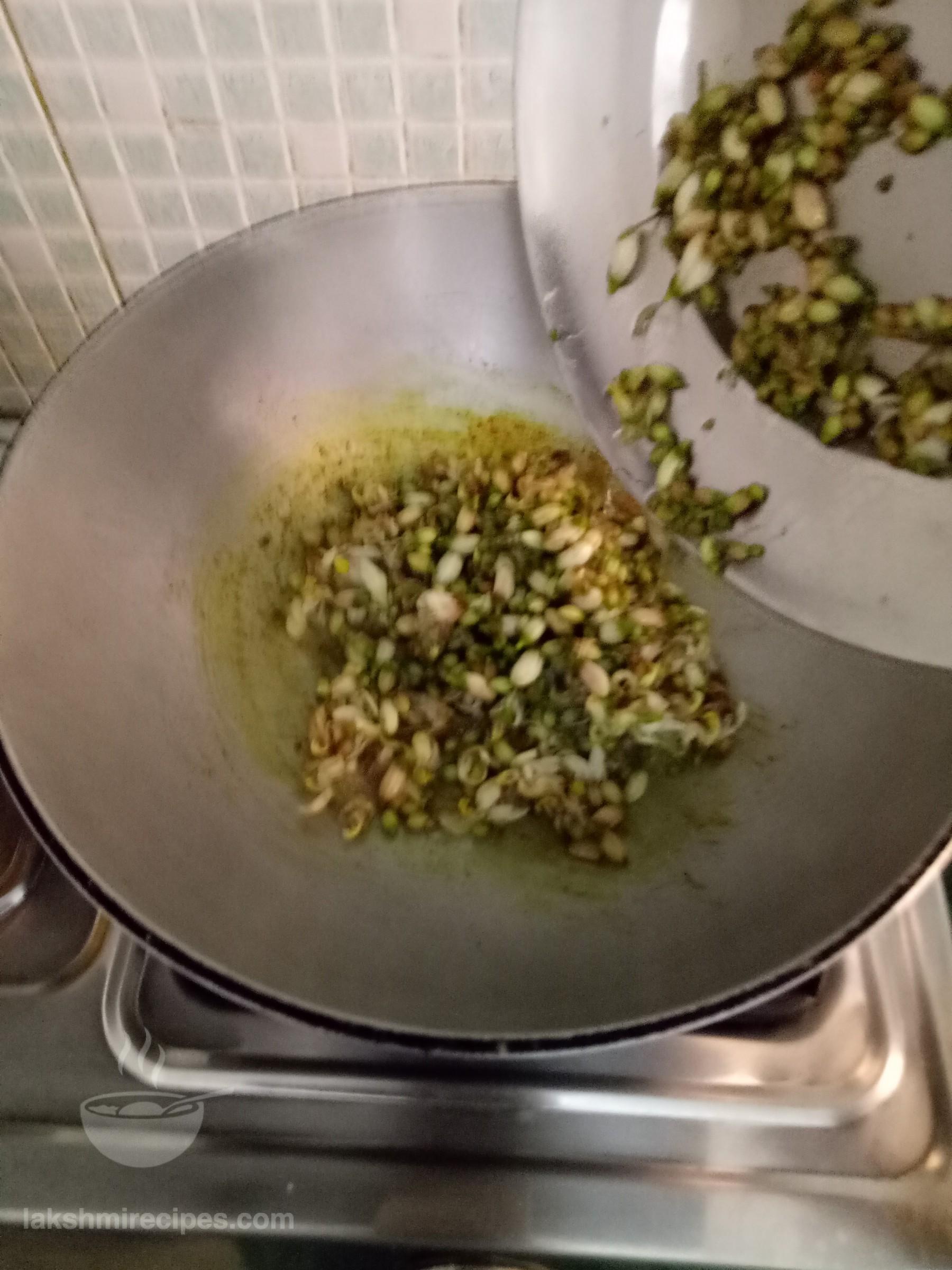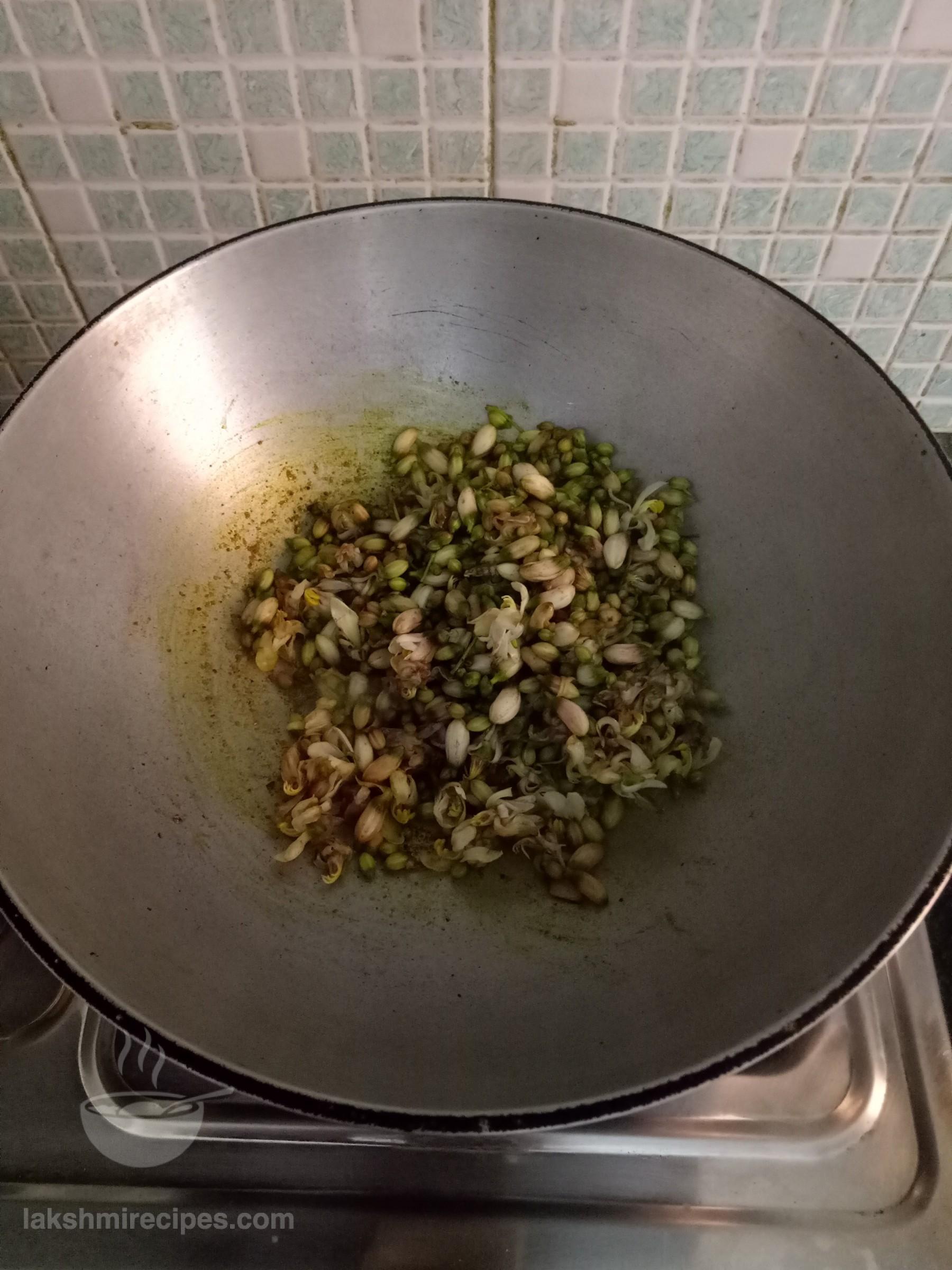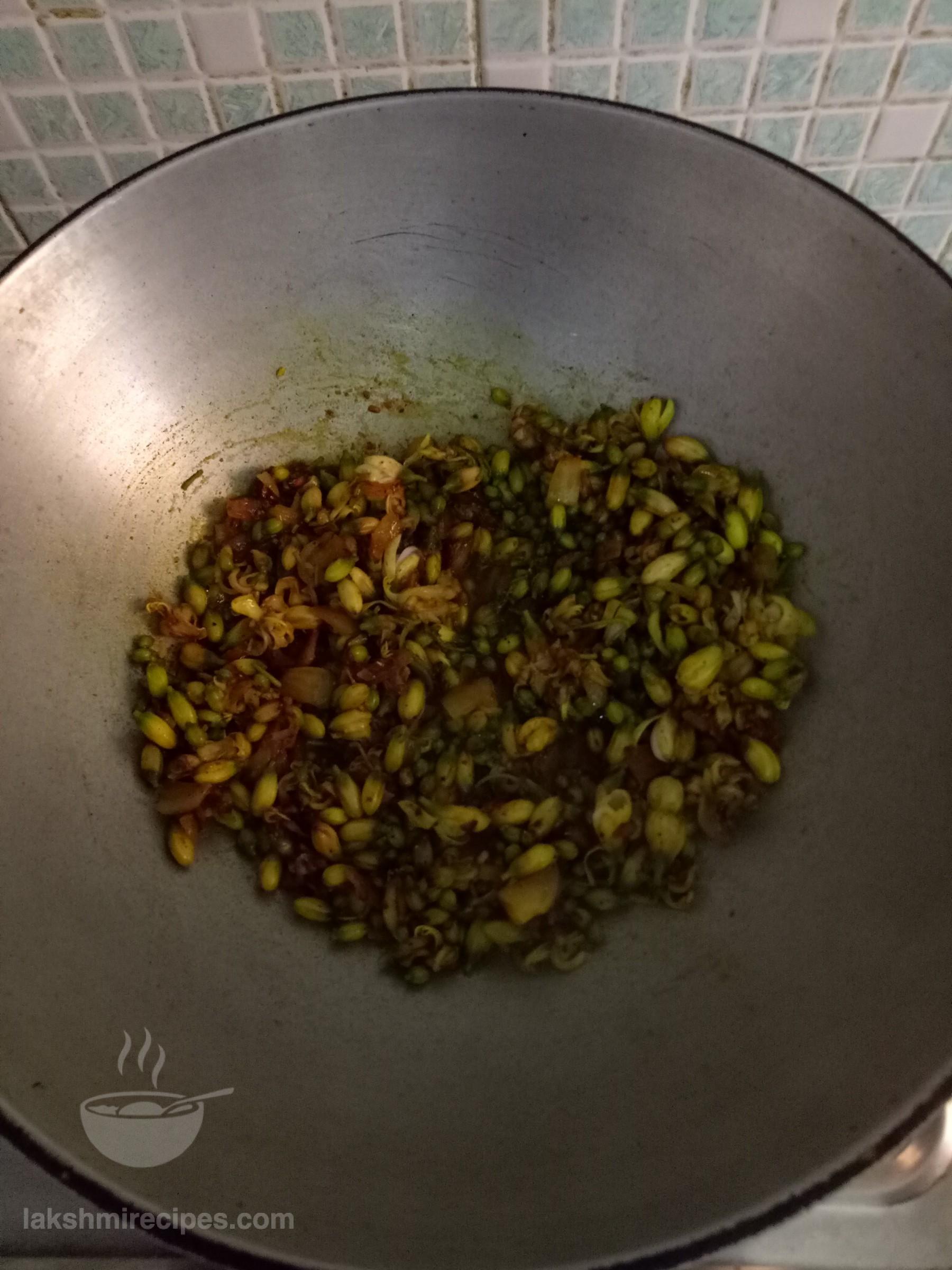 - Then add the drumstick flowers to the kadhai. Stir and cook the bhujiya being prepared for 1 minute. After cooking like this for 1 minute cover the kadhai with a lid and cook for 5-7 minutes over medium flame only. (The drumstick flowers will become soft and tender during this time)