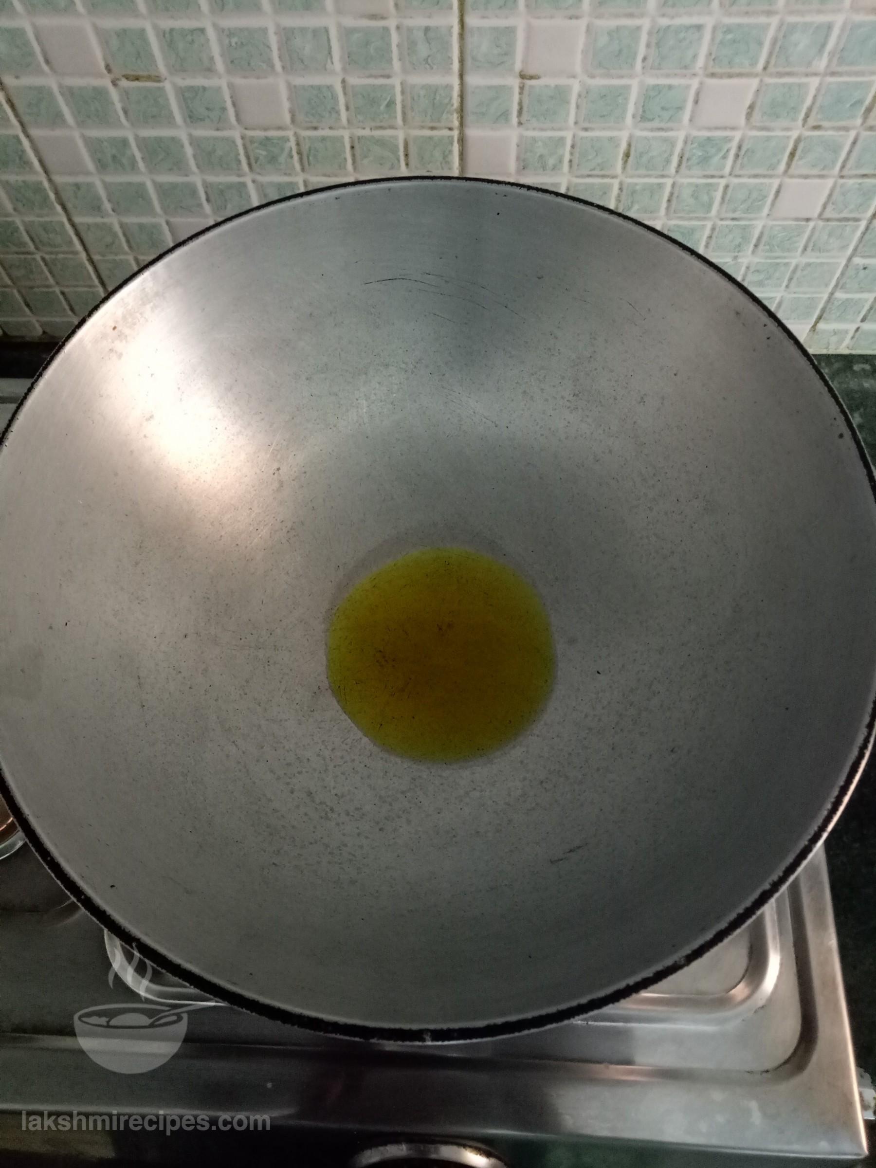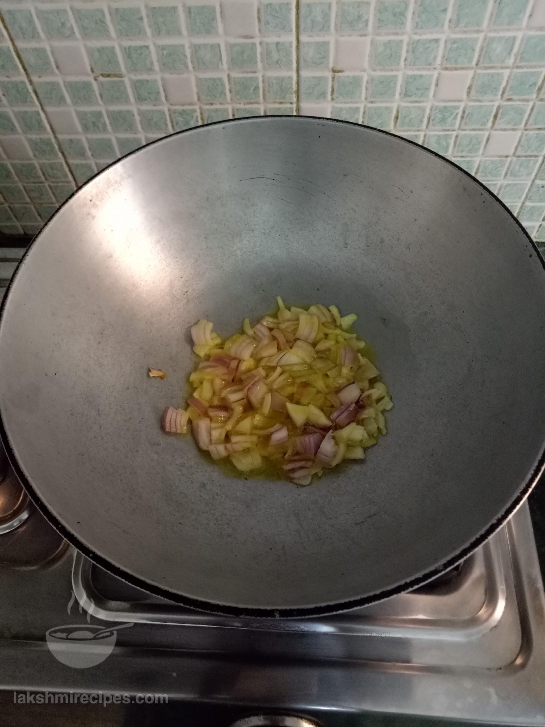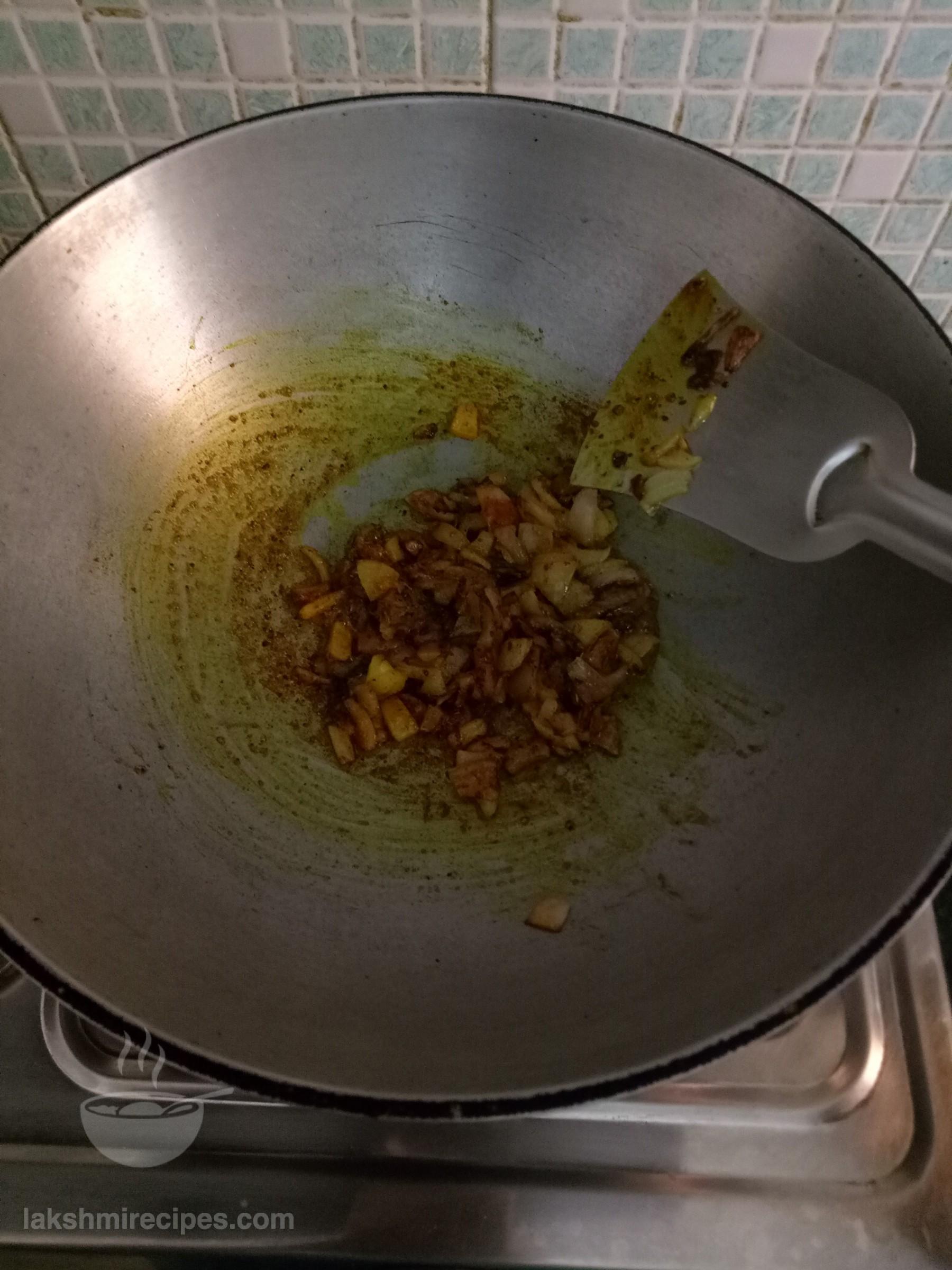 - Then heat 1 tea spoon mustard oil (sarson ka tel) in a kadhai and then add the chopped onion (pyaz) to it. Saute the onion (pyaz) till it turns golden red in color.