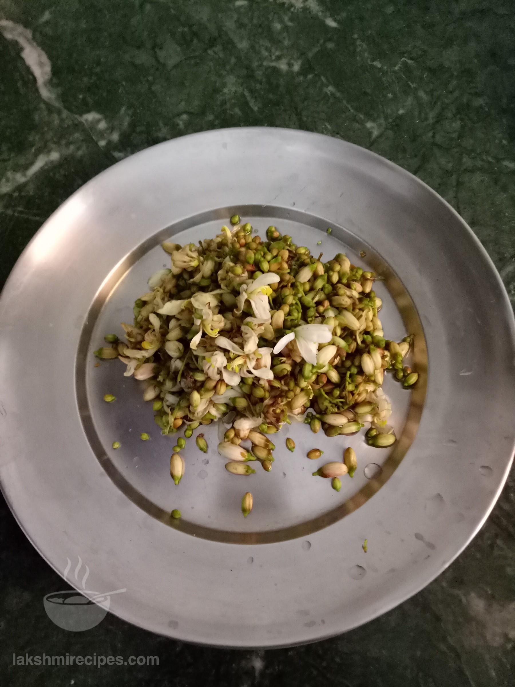 - Seperate the drumstick flowers (shehjan ke phool) from their stems and wash them well with plain water atleast 2 times.